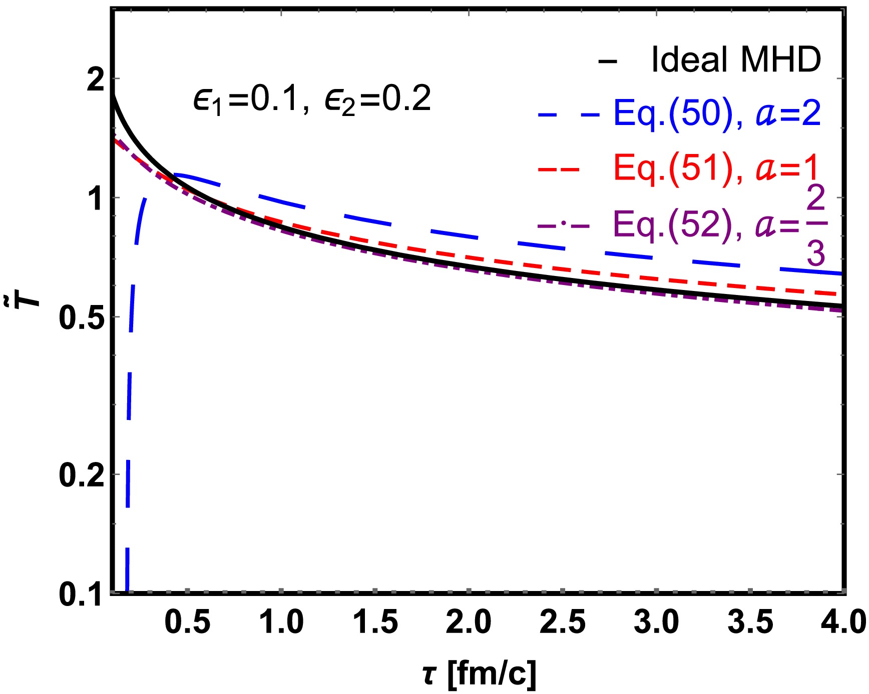 We study 1+1 dimensional relativistic non-resistive magnetohydrodynamics (MHD) with longitudinal boost invariance and a shear stress tensor. Several analytical solutions describing the fluid temperature evolution under a given equation of state (EoS)\begin{document}$ \varepsilon=3p $\end{document} ![]()