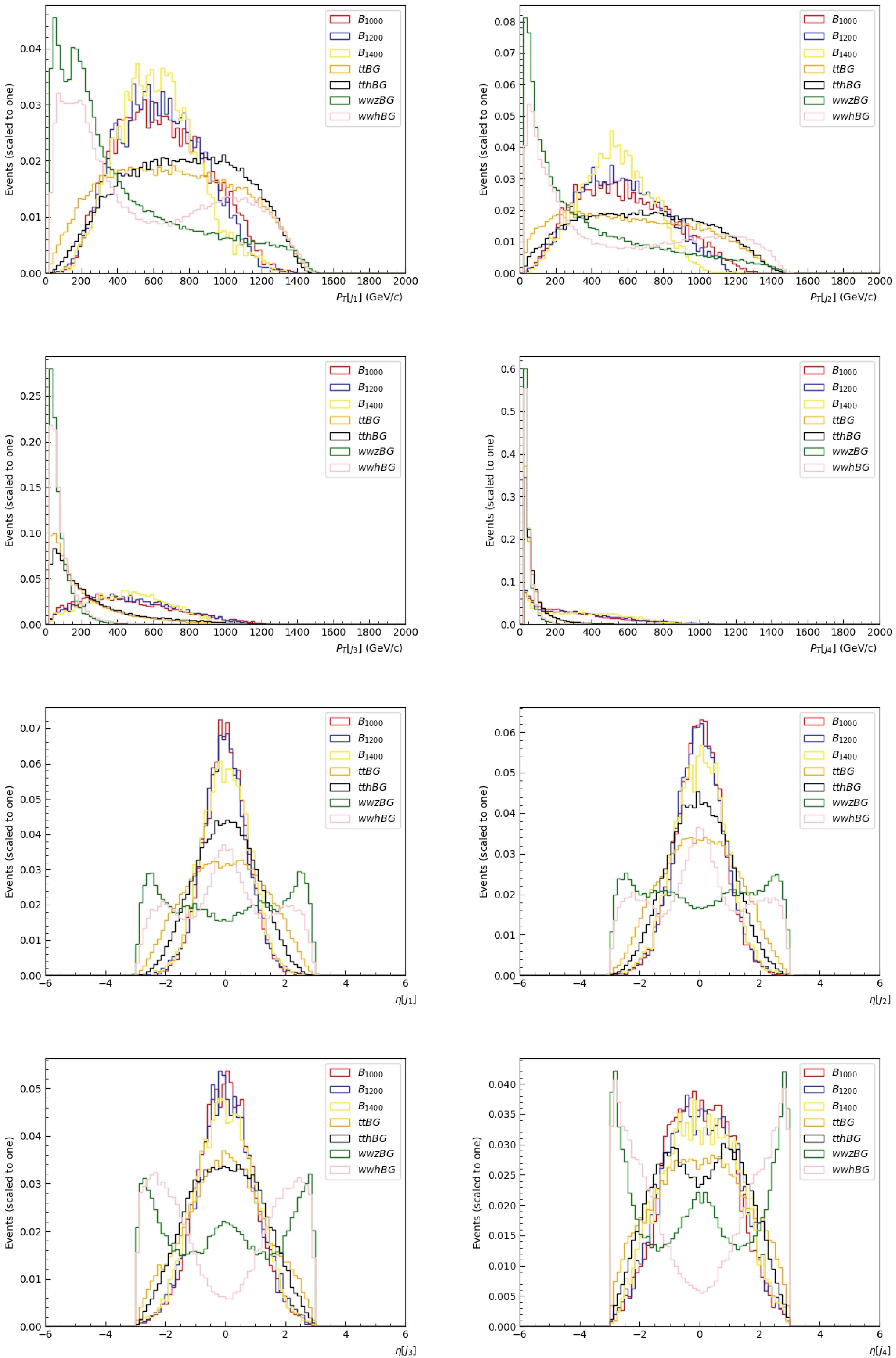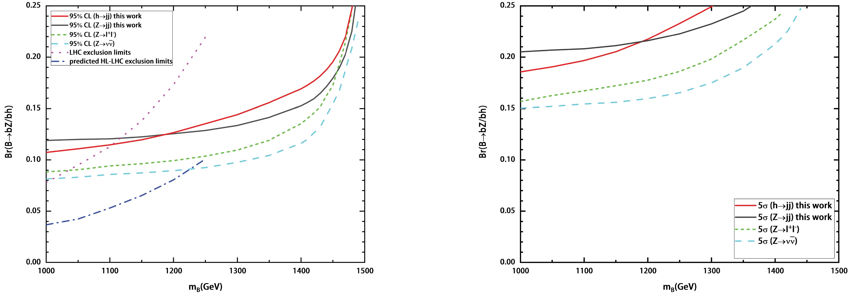 , coupled with the hadronic decay of Z and h bosons. The large mass of VLQ-B results in highly boosted Z or h bosons, which tend to form fat-jets. Using detector simulation of the signal and background events, along with jet clustering employing a large radius R, we conduct signal-background analyses. Exclusion limits at the 95% confidence level and 5\begin{document}$ \sigma $\end{document} ![]()