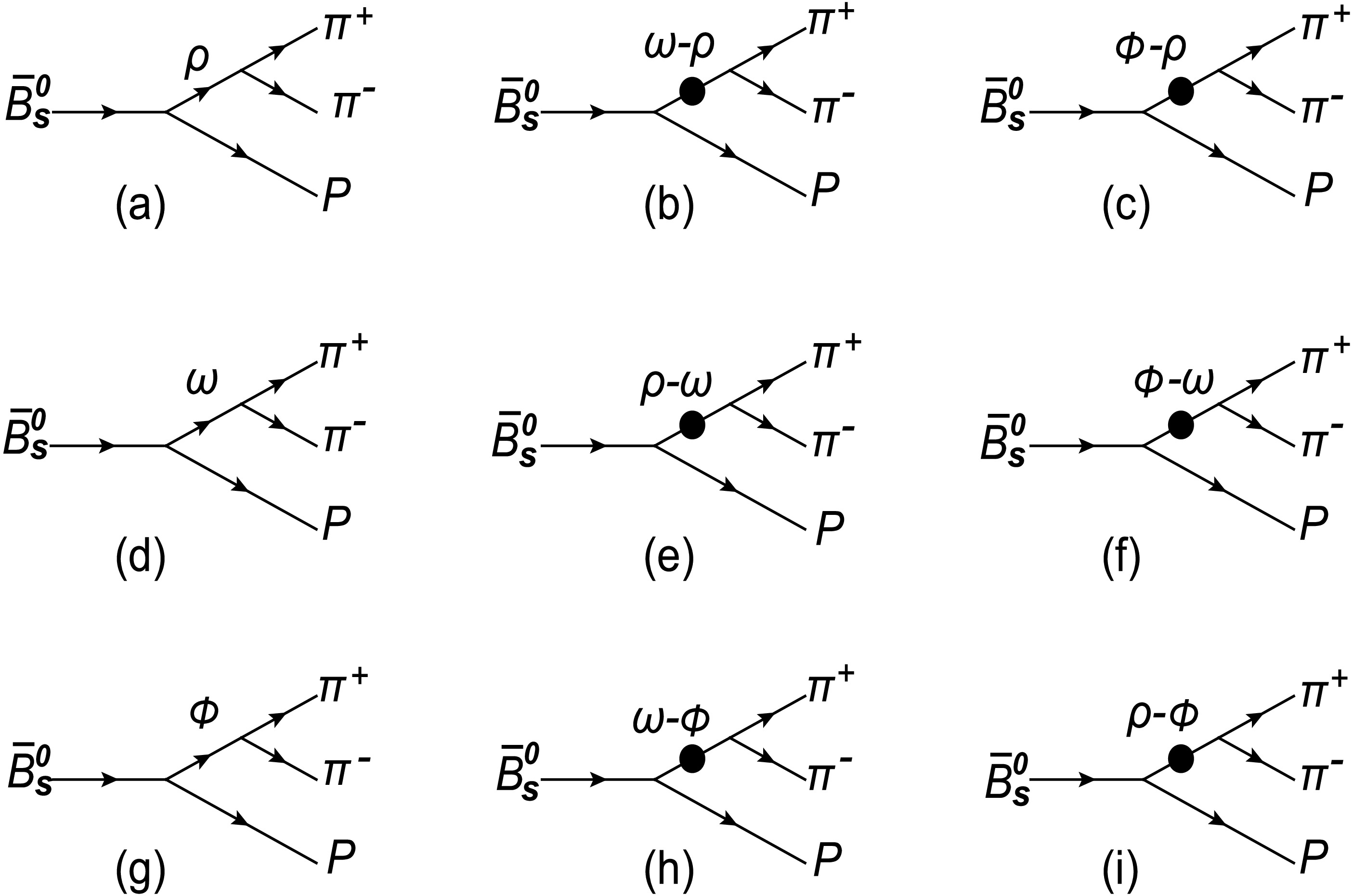 meson pairs, with a small contribution from isospin symmetry breaking. The main contribution for the middle state vector meson \begin{document}$ \rho^{0}(770)-\omega(782)-\phi(1020) $\end{document} ![]()