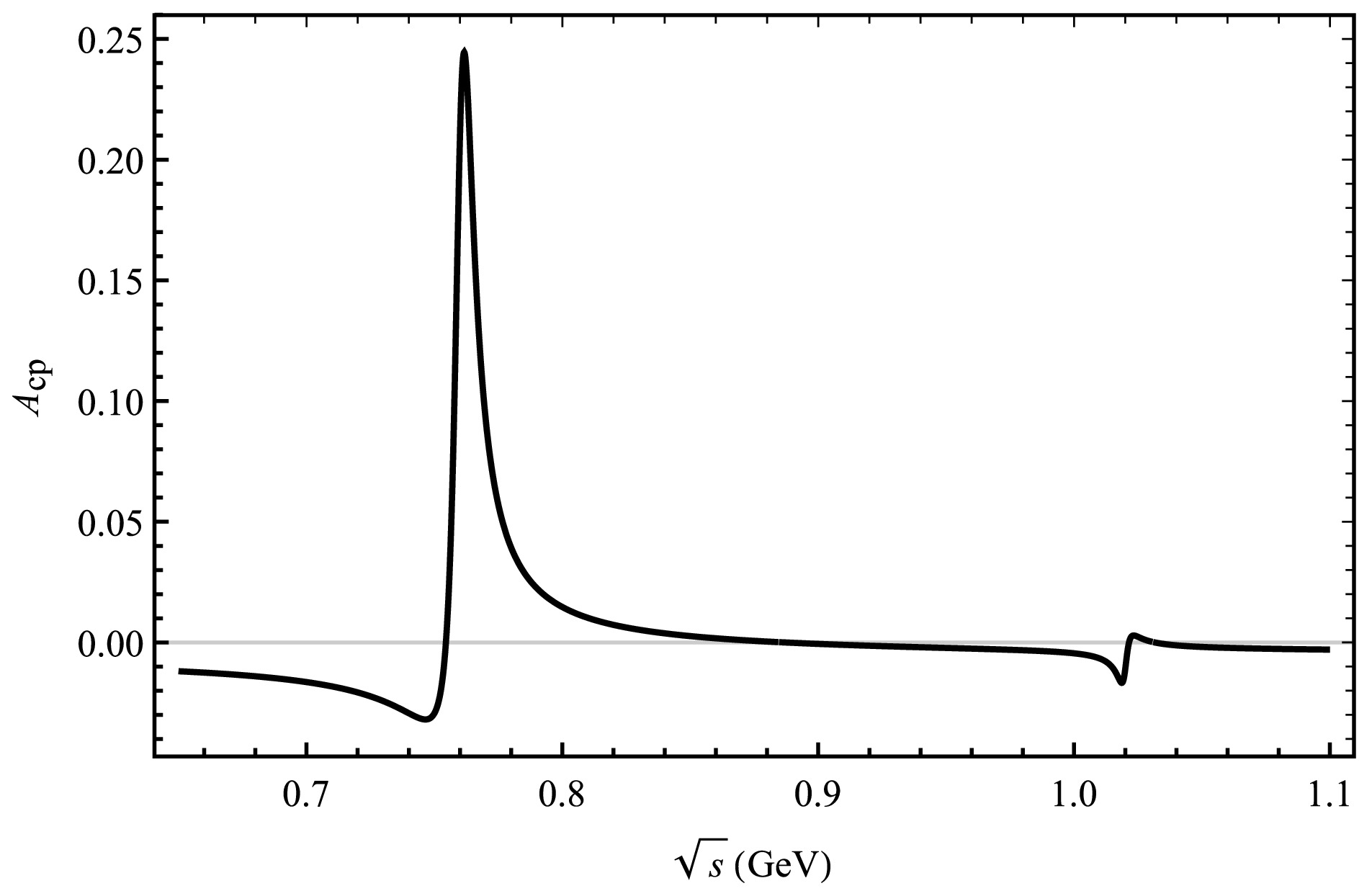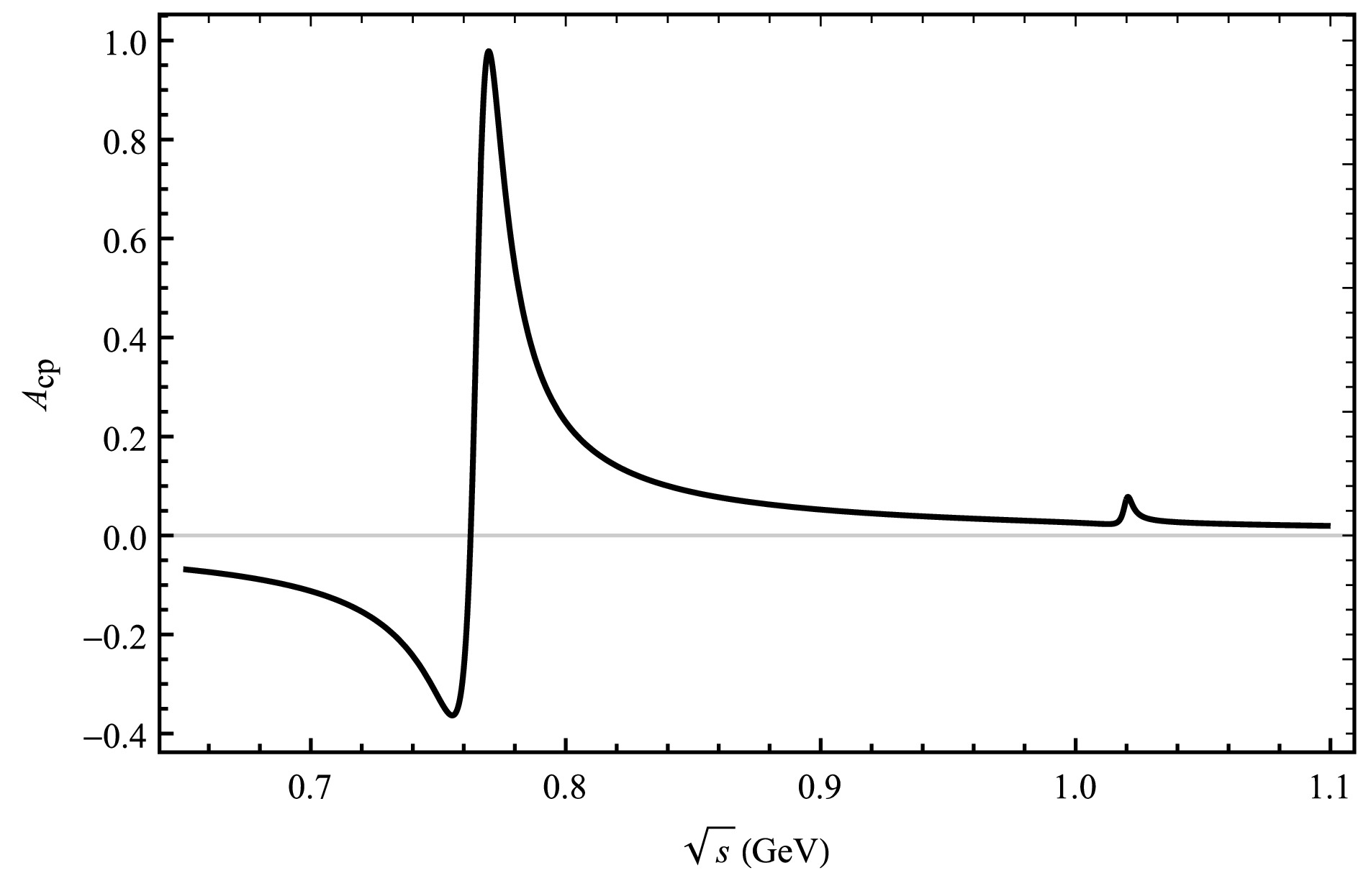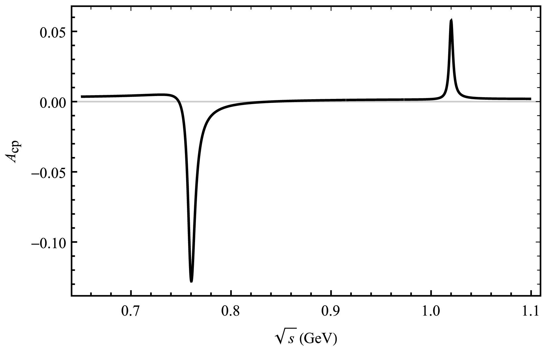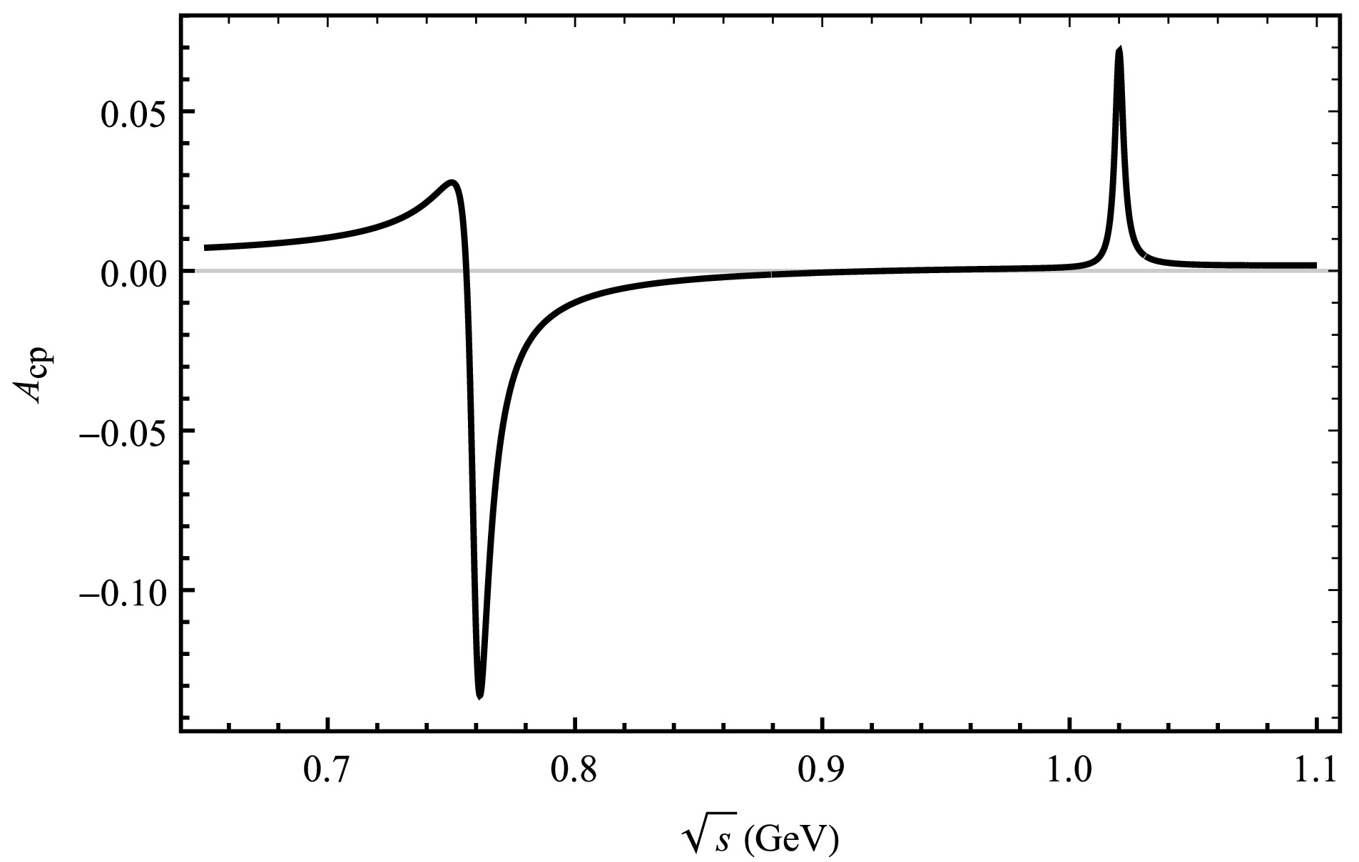 The magnitude of the direct CP asymmetry generated during the weak decay of hadrons is attributed to the weak phase and certain strong phases. The weak phase originates from the CKM matrix, while a strong phase may result from the resonance effect produced by the mixing of vector mesons\begin{document}$ V\left\{\rho^{0}(770),\,\omega(782),\,\phi(1020)\right\} $\end{document} ![]()