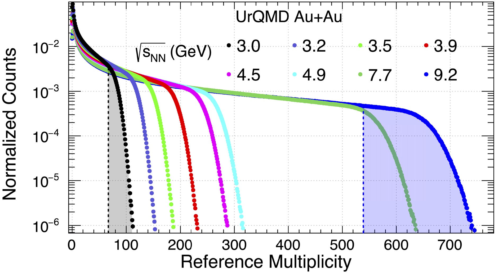 High moments of conserved quantities, such as net-baryon, net-electric charge, and net-strangeness, in heavy-ion collisions are sensitive to fluctuations caused by the quantum chromodynamics critical point (CP). The event-by-event analysis of high moments of the conserved charges has been widely used in experiments to search for the CP, particularly in the RHIC-STAR experiment. To establish a dynamical non-critical baseline, particularly in the high baryon density region, we performed a systematic analysis of the proton multiplicity distributions from Au+Au collisions at\begin{document}$ 3 \leq \sqrt{s_{NN}} \leq 9.2 $\end{document} GeV. The beam energy, centrality, and rapidity width dependence of proton (factorial) cumulants, up to the \begin{document}$ 4^{\rm th} $\end{document} order, were extracted from the calculations of a hadronic transport model called the ultra-relativistic quantum molecular dynamics (UrQMD) model. In addition, the effects of the initial volume fluctuation are discussed. These results will be important for the physics analysis of the RHIC Beam Energy Scan (BES) data, particularly for the fixed-target data and experimental data from future CBM experiments at FAIR.