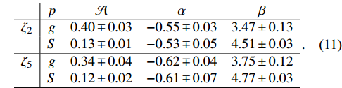 $ p = g = {\rm{glue}} $ ,$ p = S = {\rm{sea}} $ ):$ \begin{array}{l|cccc} & p & {\cal A} & \alpha & \beta \\\hline \zeta_2 & g & 0.40 \mp 0.03 & -0.55 \mp 0.03 & 3.47 \pm 0.13 \\ & S & 0.13 \mp 0.01 & -0.53 \mp 0.05 & 4.51 \pm 0.03 \\\hline \zeta_5 & g & 0.34 \mp 0.04 & -0.62 \mp 0.04 & 3.75 \pm 0.12 \\ & S & 0.12 \pm 0.02 & -0.61 \mp 0.07 & 4.77 \pm 0.03 \\\hline \end{array}\,. $