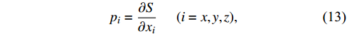 $ {\cal{X}}\equiv\left( \partial_{x}S\right) ^{2}+\left( \partial_{y}S\right) ^{2}+\left( \partial_{z}S\right) ^{2} $ , and S is the classical action. The first derivatives of S with respect to the spatial coordinates are the conjugate momenta,$ p_{i} = \frac{\partial S}{\partial x_{i}}\;\;\;\;\;\;(i = x,y,z), $