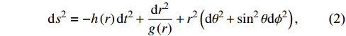 $ {\rm d}s^{2} = -h\left( r\right) {\rm d}t^{2}+\frac{{\rm d}r^{2}}{g\left( r\right) } +r^{2}\left( {\rm d}\theta^{2}+\sin^{2}\theta {\rm d}\phi^{2}\right) , $