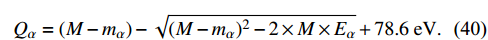 $ \alpha $ decay,$ Q_{\alpha} $ , is defined as the difference between the atomic masses of the mother and daughter nuclides:$ Q_\alpha = M_{\rm mother} - M_{\rm daughter} - M_{^4\rm{He}} . $