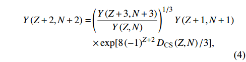$ \begin{aligned}[b] Y\left(Z+1,N+1\right) =& \left(\frac{Y\left(Z,N\right)}{Y\left(Z+3,N+3\right)}\right)^{1/3}Y\left(Z+2,N+2\right)\\& \times\exp[8\left(-1\right)^{Z+1}D_{\text{CS}}\left({Z,N}\right)/3], \end{aligned} $