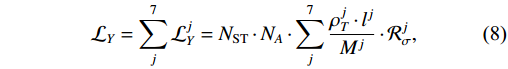 $ {\cal{L}}_{Y} $ becomes$ {\cal{L}}_{Y} = N_{\rm{ST}} \cdot \frac{N_{A}}{N_{\rm{ST}}^{\rm{MC}}} \cdot \sum\limits_{j}^{7} \sum\limits_{i}^{N_{\rm{ST}}^{\rm{MC}}} \frac{\rho_{T}^{j} \cdot l^{ij}}{M^{j}} \cdot {\cal{R}}_{\sigma}^{j}. $