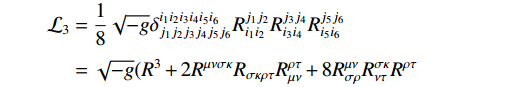 (9) $ \begin{aligned}[b] {{\cal{L}}_3} =\; & \frac{1}{8} \sqrt{-g} \delta_{j_1 j_2 j_3 j_4 j_5 j_6}^{i_1 i_2 i_3 i_4 i_5 i_6} R_{i_1 i_2}^{j_1 j_2} R_{i_3 i_4}^{j_3 j_4} R_{i_5 i_6}^{j_5 j_6} \\ =\; & \sqrt{-g} (R^3 +2 R^{\mu \nu \sigma \kappa} R_{\sigma \kappa \rho \tau} R_{\mu \nu}^{\rho \tau}+8 R_{\sigma \rho}^{\mu \nu} R_{\nu \tau}^{\sigma \kappa} R^{\rho \tau} \end{aligned} $