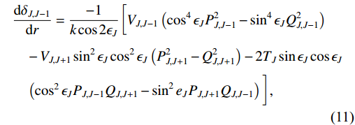 $ \begin{aligned}[b]& \frac{{\rm d}\delta_{J,J-1}}{{\rm d}r} = \frac{-1}{k\cos2\epsilon_J}\Bigg[V_{J,J-1} \left(\cos^{4}\epsilon_J P^{2}_{J,J-1} - \sin^{4}\epsilon_J Q^{2}_{J,J-1}\right) \\ &\quad - V_{J,J+1} \sin^{2}\epsilon_{J}\cos^{2}\epsilon_{J}\left(P^{2}_{J,J+1}-Q^{2}_{J,J+1}\right) - 2T_{J}\sin \epsilon_{J} \cos \epsilon_{J}\\ &\quad\left(\cos ^{2} \epsilon_J P_{J,J-1}Q_{J,J+1} - \sin ^{2}{e_J} P_{J,J+1}Q_{J,J-1}\right)\Bigg], \end{aligned} $