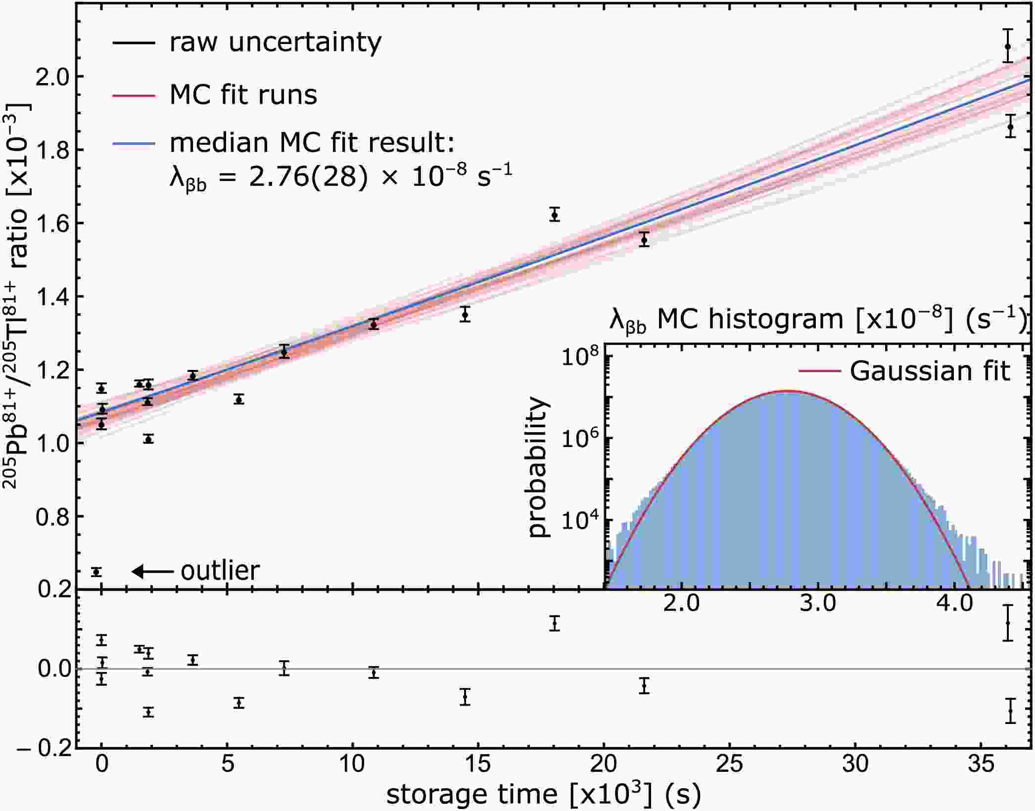 $ \pm1\sigma $ intervals of the MC simulation for that ratio. This figure also shows the best fit results from 100 sample MC runs, with the inset showing the histogram of the MC best fit results of the$ \beta_b $ decay rate.Figure 2. (color online) 205Pb/205Tl ratios for all storage periods, including the "raw uncertainty" from the corrections, alongside a sample of 100 MC fits (red) and the median MC fit result (blue), which represents the median value of the MC histogram of the final model parameters. The residuals (lower panel) highlight that some statistical variation is missing to account for the scatter in the data. The inset shows the MC histogram for