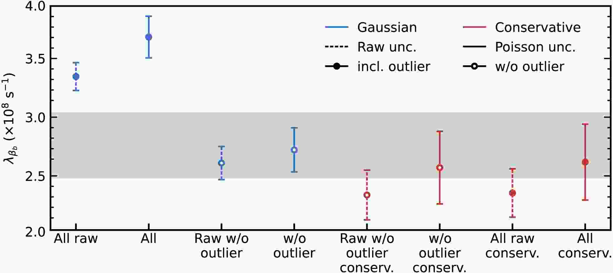 $ \lambda_{\beta_b} $ —shown in the inset of Fig. 2—gives the final uncertainty distribution for the parameter:$ \lambda_{\beta_b}=2.76(28)\times10^{-8}\; {\rm{s}}^{-1} $ , as reported in Refs. [11, 12]. This distribution includes the raw statistical error as well as the correlated systematic errors and estimated contamination variation.Another well-known weakness of the