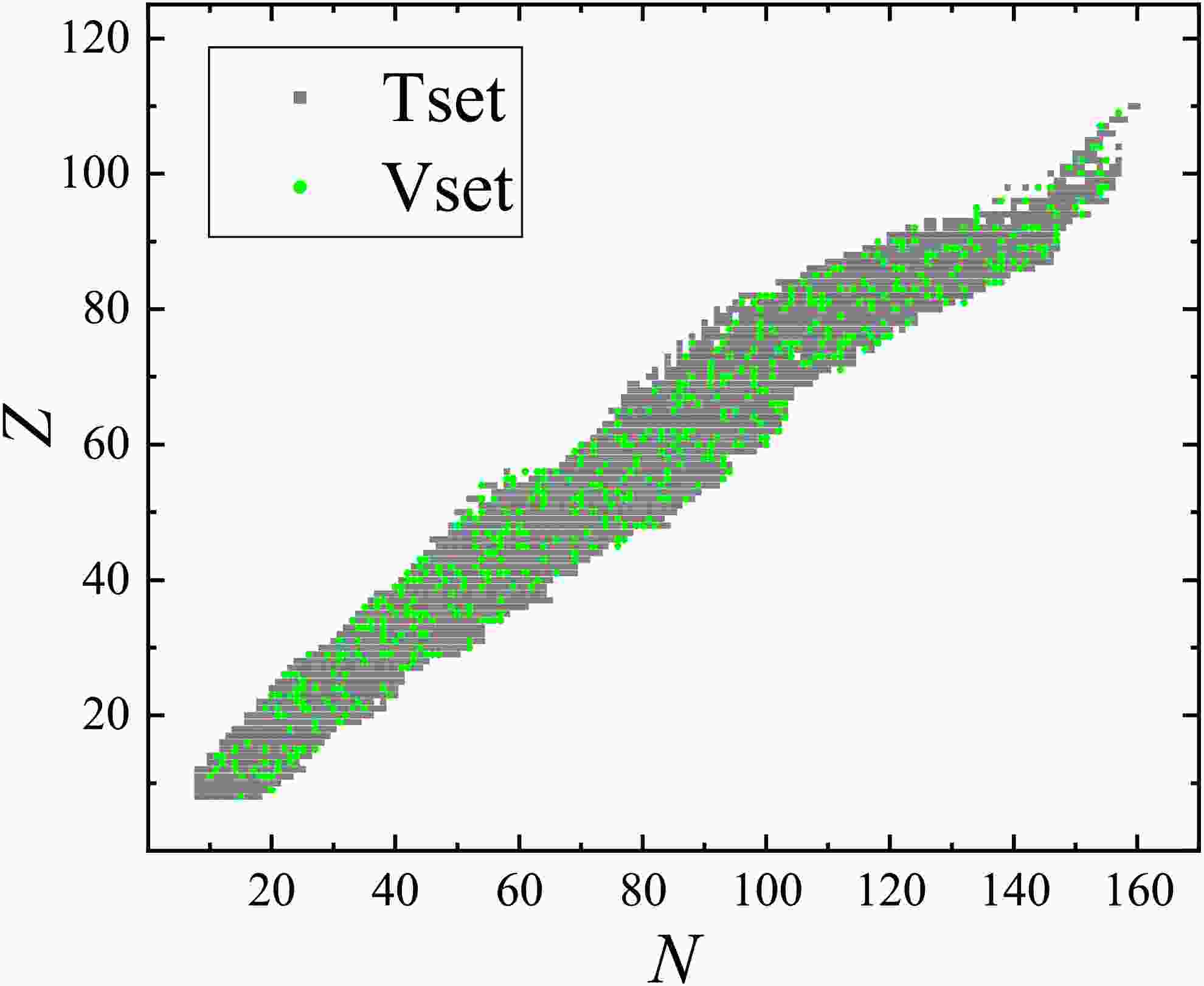 $ N, Z \geq 8 $ are randomly split into a training set (80%) and a validation set (20%), and their positions on the nuclide chart are presented in Fig. 1, labeled by gray squares and green circles, respectively. The deviations between the experimental and corresponding theoretical binding energies calculated with the LDM (see Eq. (7)) for the nuclei in the training set are adopted as the training targets y defined in Eq. (6).Figure 1. (color online) Positions of nuclei in the training set (gray squares) and validation set (green circles)