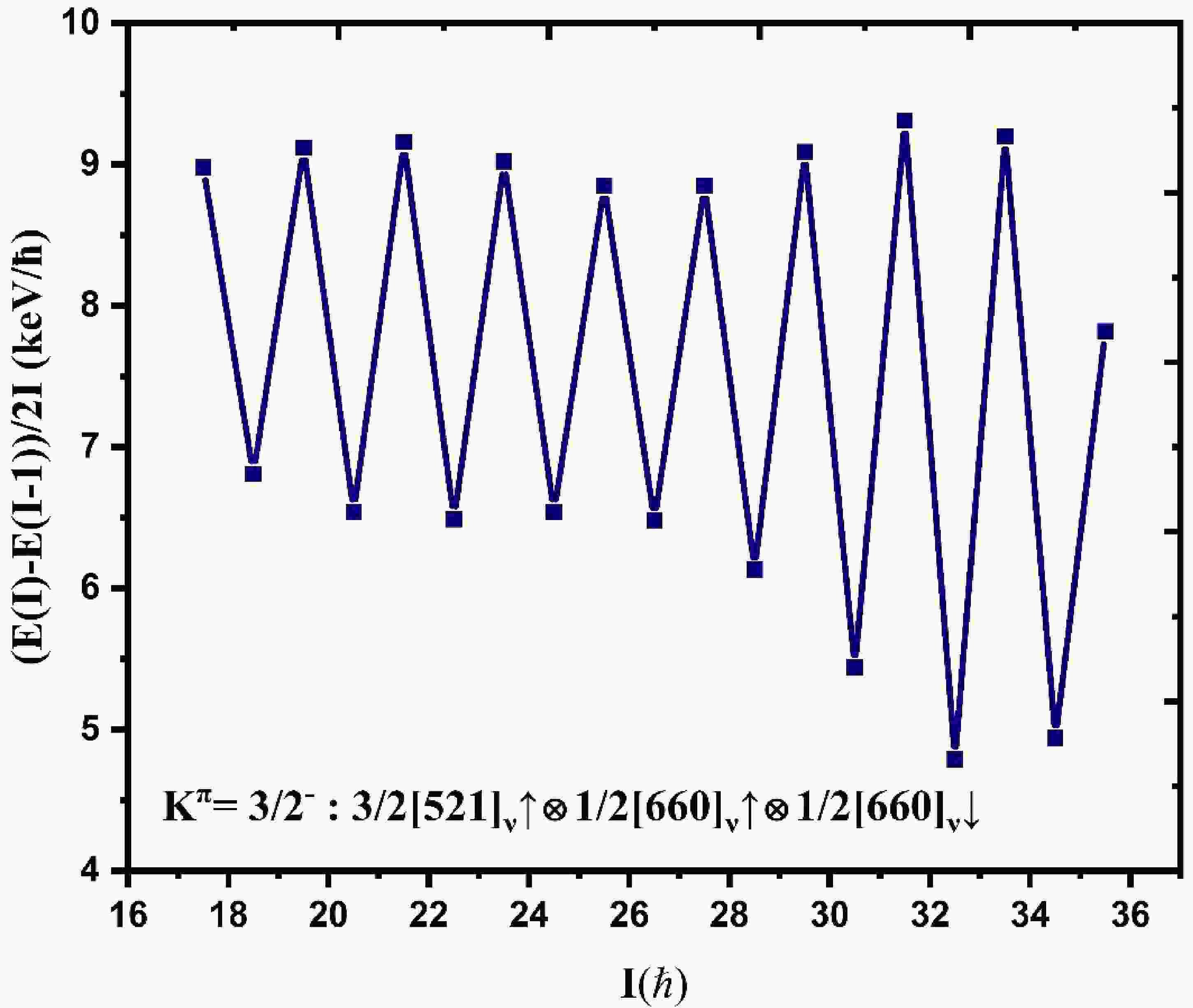 In the present work, we examined the signature splitting observed in the 3qp rotational band based on the 3/2[521]ν $\otimes $ 1/2[660]ν$\otimes $ 1/2[660]ν configuration of 155Dy (Band Nos. 5 & 7 of Ref. [17]) using 3QPPRM. This band is observed in the spin range Iπ=25/2– to 93/2– with a band crossing at Iπ=73/2–, where it changes its character from 3qp to five-quasiparticle (5qp) rotational structure [17]. Additionally, the low-lying members (below Iπ=25/2–) of the band under discussion could not identified in the available experimental investigations; hence, predictions of these members in the present calculations will guide future experimental investigations of these lower spin levels. To explain the phase as well as magnitude of experimentally observed signature splitting, the basis space consisting of 48 3qp rotational bands stemming from the combination of 5/2[512], 3/2[521], 1/2[530], 1/2[660], and 3/2[651] quasineutrons is built. Each 3qp rotational band participating in the given basis space is characterized by three parameters, namely, bandhead energy ($ {E_\alpha } $ ), inertia parameter ($ {{{\hbar ^2}} \mathord{\left/ {\vphantom {{{\hbar ^2}} {2\Im }}} \right. } {2\Im }} $ ) and Newby shift energy (${E_N}$ ). To estimate the bandhead energies of all bands comprising the given basis space of the present calculations, we use an improved version of the semi-empirical formulation [26, 27]. The input values of inertia parameters ($ {{{\hbar ^2}} \mathord{\left/ {\vphantom {{{\hbar ^2}} {2\Im }}} \right. } {2\Im }} $ ) are estimated using experimental data of the first two levels of a given 3qp rotational band, if available; otherwise, it is calculated using inertia parameters of valence nucleons of neighboring odd-A and even-even nuclei as${\Im _{3qp}} = {\Im _{(1)}} + {\Im _{(2)}} + {\Im _{(3)}} - {\Im _{even - even}}$ , where${\Im _{(1)}}$ ,${\Im _{(2)}}$ ,${\Im _{(3)}}$ are odd nucleon moments of inertia and$ \Im\mathrm{_{even-even}} $ is the moment of inertia of the even-even core. The matrix elements and single particle wavefunctions taking part in the present 3QPPRM calculations are obtained using the Nilsson model [18], with deformation parameters$ {\varepsilon _2} $ =0.210,$ {\varepsilon _4} $ =-0.02 [20] and potential parameters$ {\kappa _n} $ =0.0636,$ {\mu _n} $ =0.393 [19].In Fig. 1, we present the variation of signature splitting (E(I)-E(I-1)/2I) with spin ( $\hbar $ ) for the rotational band built over the 3/2[521]ν$\otimes $ 1/2[660]ν$\otimes$ 1/2[660]ν configuration observed in 155Dy (Band Nos. 5 & 7 of Ref. [17]). The magnitude of signature splitting within the spin range of Iπ=25/2–$\hbar $ to 71/2–$\hbar $ varies from 4.79 to 9.31 keV.  Figure 1. (color online) Experimentally observed signature splitting in three-quasineutron rotational band 3/2[521]ν $\otimes $ 1/2[660]ν$\otimes $ 1/2[660]ν of 155Dy (Band Nos. 5 & 7 of [17]).To explain the observed signature splitting, we designed a structured basis space comprising 48 3qp rotational bands taking part in the present Coriolis mixing calculations. The values of the input parameters ( $ {E_\alpha } $ ,$ {{{\hbar ^2}} \mathord{\left/ {\vphantom {{{\hbar ^2}} {2\Im }}} \right. } {2\Im }} $ , and${E_N}$ ) are varied within physical limits by minimizing χ2 deviation [28] among calculated level energies and experimental data. The optimized set of values of the input parameters pertaining to the strongly interacting rotational bands are listed in Table 1. In Fig. 2, we present a comparison of experimental and calculated energies; from this figure, it is clear that level energies of the three-quasineutron band under discussion are well-reproduced with a reasonable RMS deviation of 68.13 keV. These level energies along with calculated and experimental values of Eγ (M1) and Eγ (E2) are listed in Table 2.S.No Configuration Ω[NnzΛ]∑ Kπ Eα/keV Inertia/(ħ2/keV−1) GM Splitting /(Newby shift)/keV (1,2) (2,3) (3,1) 1. 5/2[512]ν↑ $\otimes $ 3/2[651]ν↑  $\otimes $ 1/2[660]ν↓  7/2- 2202.1 8.27 368 400 368 2. 5/2[512]ν↑ $\otimes $ 3/2[651]ν↑  $\otimes $ 3/2[651]ν↓  5/2- 2080.1 8.27 368 400 (−70) 368 3. 3/2[521]ν↑ $\otimes $ 1/2[660]ν↑  $\otimes $ 1/2[660]ν↓  3/2- 1000.0 8.61 368 400 (66.15) 368 4. 3/2[521]ν↑ $\otimes $ 1/2[660]ν↑  $\otimes $ 3/2[651]ν↓  1/2- 1505.0 8.27 368 400 368 (200) 5. 3/2[521]ν↓ $\otimes $ 1/2[660]ν↑  $\otimes $ 3/2[651]ν↑  1/2- 1537.0 8.27 368 400 368 (200) 6. 3/2[521]ν↑ $\otimes $ 3/2[651]ν↑  $\otimes $ 1/2[660]ν↓  5/2- 1305.0 8.27 368 (200) 400 368 7. 3/2[521]ν↑ $\otimes $ 3/2[651]ν↑  $\otimes $ 3/2[651]ν↓  3/2- 1382.9 8.27 368 (200) 400 (−70) 368 (200) Matrix elements among quasineutron states $ \left\langle {{1 \mathord{\left/ {\vphantom {1 2}} \right. } 2}\left[ {530} \right]} \right|{J_ + }\left| {{1 \mathord{\left/ {\vphantom {1 2}} \right. } 2}\left[ {530} \right]} \right\rangle $   −0.971 (2.854) $ \left\langle {{1 \mathord{\left/ {\vphantom {1 2}} \right. } 2}\left[ {660} \right]} \right|{J_ + }\left| {{1 \mathord{\left/ {\vphantom {1 2}} \right. } 2}\left[ {660} \right]} \right\rangle $   0.069 (1.082) $ \left\langle {{3 \mathord{\left/ {\vphantom {3 2}} \right. } 2}\left[ {651} \right]} \right|{J_ + }\left| {{1 \mathord{\left/ {\vphantom {1 2}} \right. } 2}\left[ {660} \right]} \right\rangle $   0.923 (2.558) $ \left\langle {{1 \mathord{\left/ {\vphantom {1 2}} \right. } 2}\left[ {660} \right]} \right|{J_ + }\left| {{1 \mathord{\left/ {\vphantom {1 2}} \right. } 2}\left[ {660} \right]} \right\rangle $   0.069 (0.174) $ \left\langle {{3 \mathord{\left/ {\vphantom {3 2}} \right. } 2}\left[ {651} \right]} \right|{J_ + }\left| {{1 \mathord{\left/ {\vphantom {1 2}} \right. } 2}\left[ {660} \right]} \right\rangle $   0.923 (1.546) Table 1. Optimized set of parameters (bandhead energies (Eα), inertia parameter (ħ2/keV-1), Newby shift, and matrix elements) of the strongly interacting rotational ban