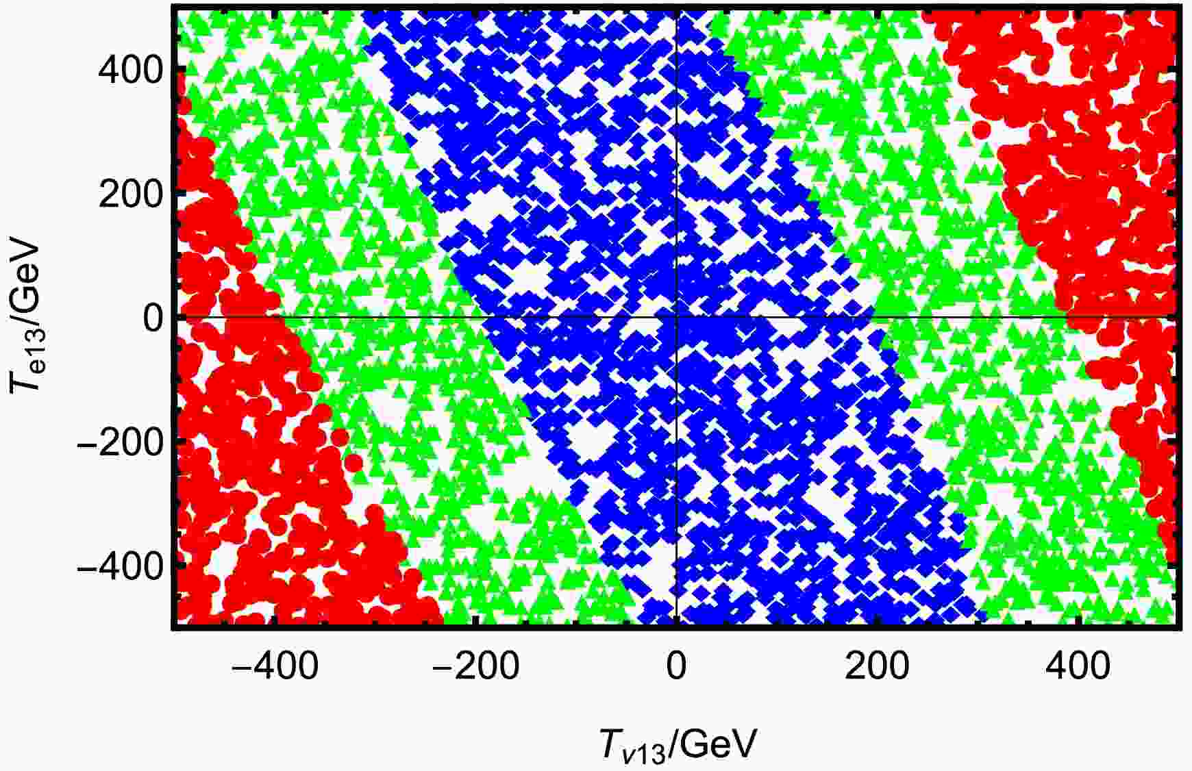 $ (\tau \rightarrow e K^+K^-) $ in the two-dimensional parameter plane of$ M_{\tilde{L}}^2 $ and$ M_{\tilde{L}13}^2 $ . ● are located mainly in the upper left part of the image, specifically in the area where$ M_{\tilde{L}}^2 $ is smaller and$ M_{\tilde{L}13}^2 $ is larger. In this region, the branching ratio is more likely to exceed$ 10^{-10} $ . ▲ are distributed predominantly in the middle zone, forming a transition band along the direction from bottom left to top right, showing an obvious oblique structure of the color boundary. Meanwhile, ◆ are clustered in the lower right corner area, indicating that the branching ratio is relatively small when$ M_{\tilde{L}}^2 $ is larger and$ M_{\tilde{L}13}^2 $ is smaller. As can be seen from Fig. 10(c), the branching ratio is significantly positively correlated with$ M_{\tilde{L}13}^2 $ , whereas$ M_{\tilde{L}}^2 $ has a secondary but still important effect on BR$ (\tau \rightarrow e K^+K^-) $ , inhibiting the branching ratio.Parameters Min Max $ T_{e13}/\rm GeV $ –500 500 $ T_{\nu13}/\rm GeV $ –500 500 Table 5. Scanning parameters for Fig. 11.