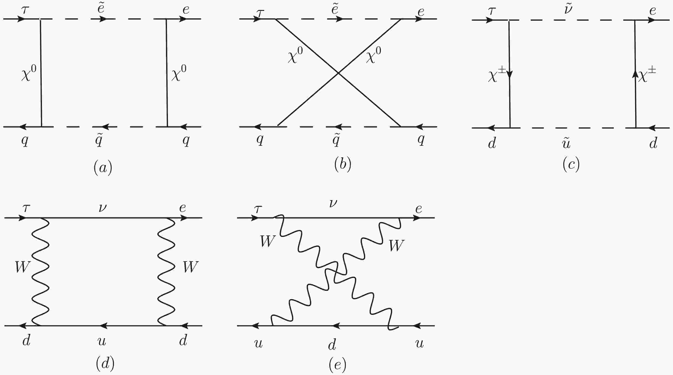 $ \chi^{\pm} $ , neutral scalars$ \tilde{\nu} $ , and squark$ \tilde{u} $ . The effective amplitude$ \mathcal{M}_{(c)} $ from the box diagram with virtual charged fermion contribution is$ \begin{aligned}[b] \mathcal{M}_{(c)}=\;&\sum_{F_1,F_2=\chi^{\pm},\chi^{\pm}} \sum_{S_1,S_2=\tilde{\nu},\tilde{u}}\Big\{\frac{1}{2}I_8(x_{F_1},x_{F_2},x_{S_1},x_{S_2})\Big[\frac{1}{2}H_L^{S_1\tau\bar{F_1}}H_R^{S_1 F_2\bar{e}}H_R^{S_2 F_1 \bar{d}}H_L^{S_2 d\bar{F_2}}\times(\bar{e} \gamma^\mu P_L \tau)(\bar{d} \gamma_\mu P_L d)\\& -H_R^{S_1\tau\bar{F_1}}H_R^{S_1 F_2\bar{e}}H_L^{S_2 F_1 \bar{d}}H_L^{S_2 d\bar{F_2}}\times(\bar{e} P_R \tau)(\bar{d} P_L d)\Big]+\frac{1}{8}I_9(x_{F_1},x_{F_2},x_{S_1},x_{S_2}) \Big[m_{F_1}m_{F_2}H_L^{S_1\tau\bar{F_1}}H_L^{S_1 F_2\bar{e}}H_L^{S_2 F_1 \bar{d}}H_L^{S_2 d\bar{F_2}}\\&\times[(\bar{e} P_R \tau)(\bar{d} P_R d) -(\bar{e} P_R \tau)(\bar{d} P_L d)-(\bar{e} P_L \tau)(\bar{d} P_R d)-3(\bar{e} P_L \tau)(\bar{d} P_L d)-(\bar{e}\sigma_{\mu\nu}P_L \tau)(\bar{d} \sigma^{\mu\nu}P_L d) -(\bar{e}\sigma_{\mu\nu}P_R \tau)(\bar{d} \sigma^{\mu\nu}P_L d)]\\&+H_R^{S_1\tau\bar{F_1}}H_L^{S_1 F_2\bar{e}}H_R^{S_2 F_1 \bar{d}}H_L^{S_2 d\bar{F_2}}\times[-4(\bar{e} \gamma^\mu P_R \tau)(\bar{d} \gamma_\mu P_L d) +(\bar{e} P_R \tau)(\bar{d} P_R d)-(\bar{e} P_R \tau)(\bar{d} P_L d)\\&-(\bar{e} P_L \tau)(\bar{d} P_R d)+(\bar{e} P_L \tau)(\bar{d} P_L d)]\Big] +(L \leftrightarrow R)\Big\}. \end{aligned} $