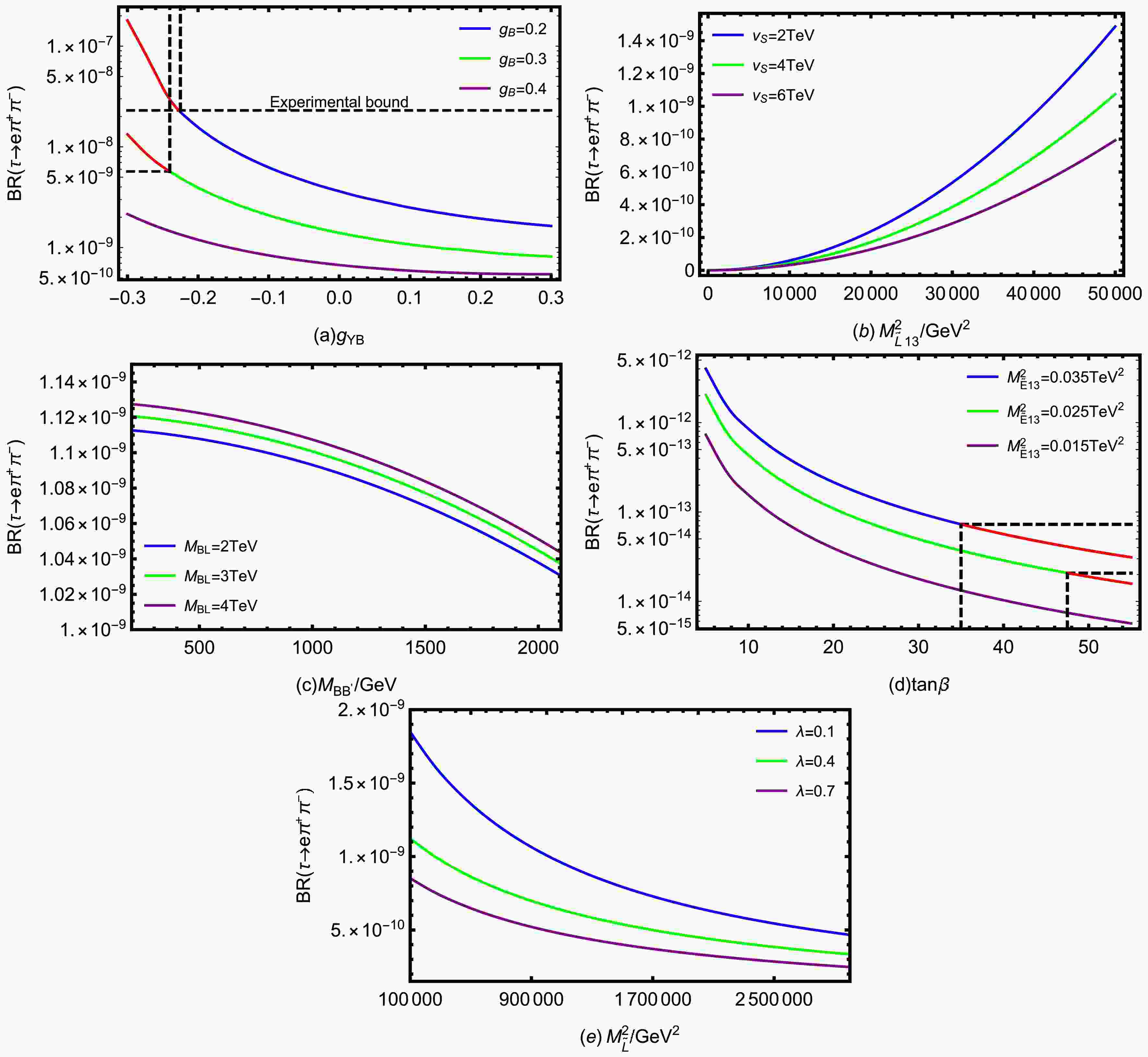 $ g_{YB}=0.1 $ ,$ g_B=0.3 $ ,$ \lambda=0.4 $ ,$ M_{BB'}=0.1\; {\rm{TeV}} $ ,$ M_{BL}=1\; {\rm{TeV}} $ ,$ v_S=4\; {\rm{TeV}} $ ,$ M_{\tilde{L}}^2=0.16\; {\rm{TeV^2}} $ , we study the relationship between BR ($ \tau \rightarrow e \pi^+\pi^- $ ) and$ \tan\beta $ in Fig. 5(d), where the curves are divided into three cases corresponding to$ M_{\tilde{E}13}^2=0.035\; {\rm{TeV^2}} $ (blue curve),$ M_{\tilde{E}13}^2=0.025\; {\rm{TeV^2}} $ (green curve), and$ M_{\tilde{E}13}^2=0.015\; {\rm{TeV^2}} $ (purple curve). The parameter$ \tan\beta $ is defined as the ratio of the VEVs of the two Higgs doublets, namely$ \tan\beta=v_u/v_d $ . This parameter influences the vertex couplings and particle masses by directly affecting$ v_d $ and$ v_u $ . Because$ \tan\beta $ appears in almost all the mass matrices of Fermions, scalars, and Majoranas, it must be a highly sensitive parameter. For each curve, the branching ratio decreases by about 2 to 3 orders of magnitude as$ \tan\beta $ increases from 5 to 55.$ M_{\tilde{E}13}^2 $ denotes the flavor off-diagonal term between τ and e in the slepton softbreaking mass matrix, which essentially reflects the mixing strength among right-handed slepton SUSY particles. A larger$ M_{\tilde{E}13}^2 $ implies stronger lepton flavor mixing, which amplifies the loop contributions, leading to an upward shift in the overall branching ratio level. The right ends of the blue and green curves are marked in red, indicating that the corresponding parameter points have not exceeded the current experimental upper limit of$ \tau \rightarrow e \pi^+\pi^- $ , and thus, they have violated the constraint of$ \tau\rightarrow e\gamma $ . By contrast, the purple curve is allowed under both experimental limits because of its relatively low overall branching ratio.Based on
