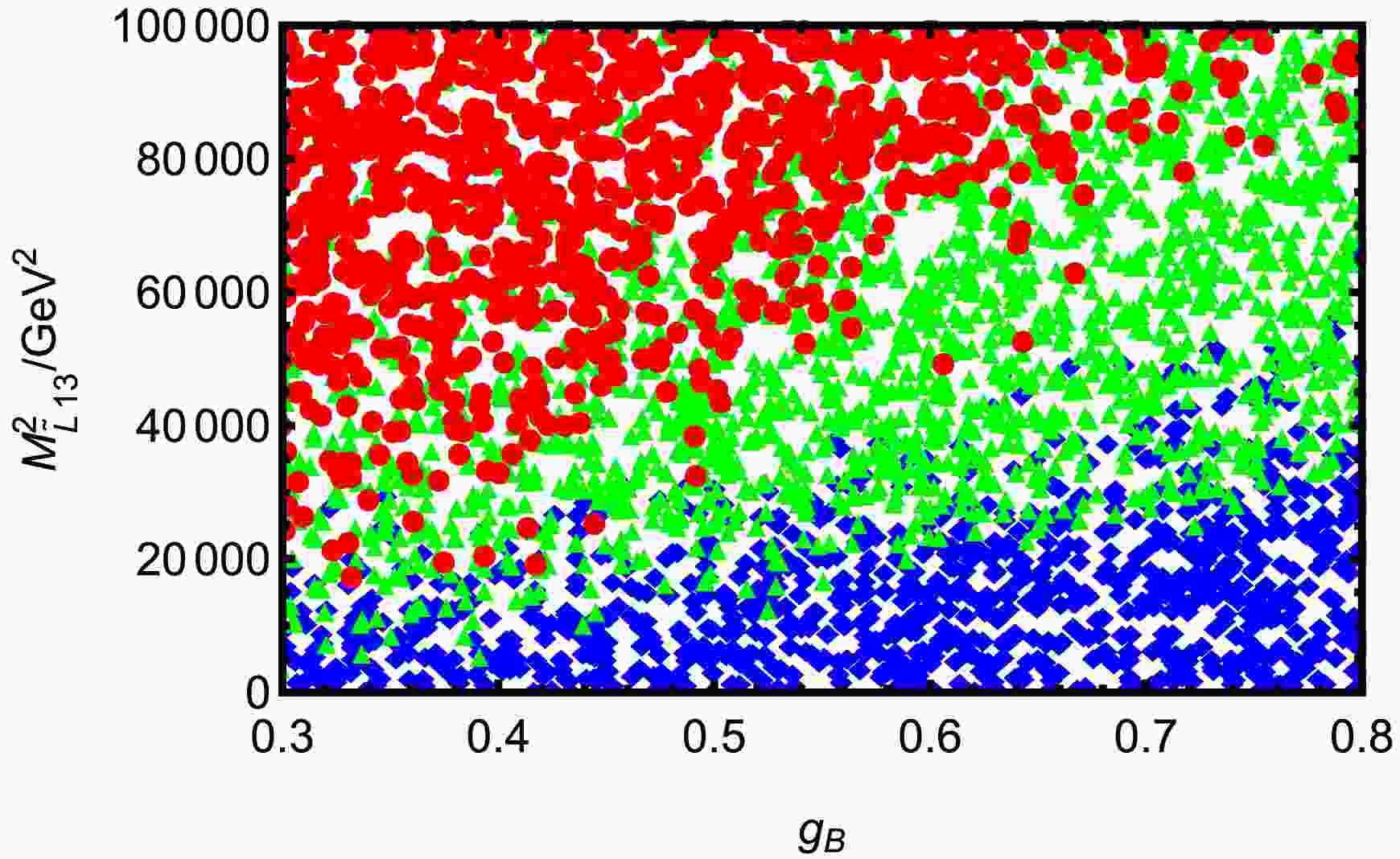$ T_\nu=1\; {\rm{TeV}},\; T_e= 1.5\; {\rm{TeV}} $ , and$ M_{\tilde{L}}^2=0.16\; {\rm{TeV^2}} $ , the relationship between$ g_B $ and$ M_{\tilde{L}13}^2 $ is shown in Fig. 6. Fig. 6 is plotted based on the parameters shown in Table 2. ◆ are distributed mainly in the lower area of Fig. 6, concentrated especially in the lower right corner. Within the range of$ M_{\tilde{L}13}^2< 2\times10^4\; {\rm{GeV^2}} $ , ◆ are the most densely distributed regardless of the value of$ g_B $ . ● are concentrated in the upper left part of Fig. 6 and are particularly dense in the region of$ 0.3<g_B<0.6, \; 4\times10^4\; {\rm{GeV^2}}< M_{\tilde{L}13}^2< 1\times10^5\; {\rm{GeV^2}} $ , where there are basically no ◆ and ▲, indicating that most of the points in this parameter range correspond to larger branching ratios. ▲ are located between the ● and ◆ areas. ▲ gradually transition to the ● area toward the upper left and connect to the ◆ area toward the lower right, presenting a boundary structure along the diagonal direction. This distribution indicates that the two parameters have a significant joint effect on BR ($ \tau \rightarrow e \pi^+K^- $ ), where the branching ratio tends to be larger for larger$ M_{\tilde{L}13}^2 $ and smaller$ g_B $ .Figure 6. (color online) Under the premises of current limits on LFV decays