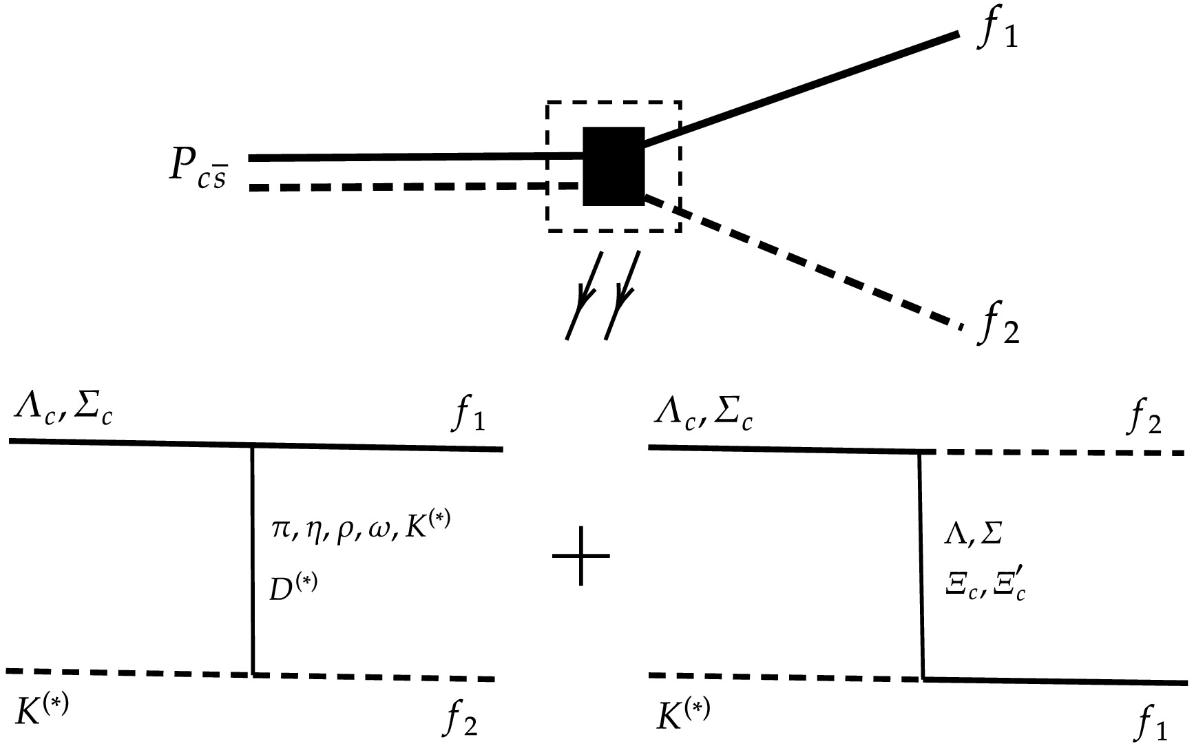 In this work, we focus on the two-body strong decay properties for the predicted $ P_{c\bar{s}} $ molecules via$ S $ -wave interactions. In Fig. 1, we present the relevant diagram, where the interactions can occur through the exchange of either a meson (left side) or a baryon (right side) between the molecular constituents.  Figure 1. Diagram for the $ P_{c\bar{s}} $ molecules decaying into$ f_{1} $ and$ f_{2} $ final states.For a hadronic molecule composed of several channels $ |i\rangle=\sum_n|A_nB_n\rangle $ , where$ A_n $ and$ B_n $ denote the molecular constitutions in the$ n $ -th channel, the two-body decay interactions for the$ i\to f_1+f_2 $ process are related to the interactions for the$ A_n+B_n\to f_1+f_2 $ process, as follows:$ \begin{aligned}[b] \langle f_1f_2|V|i\rangle & = \sum_n\langle f_1f_2|V|A_nB_n\rangle\langle A_nB_n|i\rangle\\ & = \sum_n\int\frac{{\rm d}^3k {\rm d}^3r}{(2\pi)^3}{\rm e}^{-{\rm i}{\boldsymbol{k}}\cdot{\boldsymbol{r}}} \psi_{A_nB_n}({\boldsymbol{r}})\langle f_1f_2|V|A_nB_n\rangle. \end{aligned} $  (1) Here, $ \psi_{A_nB_n}({\boldsymbol{r}}) $ is the wave function for the$ n $ -th channel in the$ r $ -coordinate space. Considering the different normalization conventions used for the scattering amplitude, we obtain$ \langle f_1f_2|V|i\rangle = -\frac{{\cal{M}}(i\to f_1+f_2)}{\sqrt{2E_{i}}\sqrt{2E_{f_1}}\sqrt{2E_{f_2}}}, $  (2) $ \begin{align} &\langle f_1f_2|V|A_nB_n\rangle = \\ &\quad\quad\quad\,-\frac{{\cal{M}}\left(A_n({\boldsymbol{k}})+B_n(-{\boldsymbol{k}})\to f_1({\boldsymbol{p}})+f_2(-{\boldsymbol{p}})\right)}{\sqrt{2E_{A_n}} \sqrt{2E_{B_n}}\sqrt{2E_{f_1}}\sqrt{2E_{f_2}}}.\quad\,\, \end{align} $  (3) In the rest frame of the initial state, the partial decay width for the $ i\to f_1+f_2 $ process can be expressed as$ {\rm d}\Gamma = \frac{1}{2J+1}\frac{|{\boldsymbol{p}}|}{32\pi^2 m_{i}^2}|{\cal{M}}(i\to f_1+f_2)|^2 {\rm d}\Omega, $  (4) where J and $ m_i $ are the spin and mass of the initial state, respectively.$ {\boldsymbol{p}} $ is the three momentum for the final states, which is expressed as$ |{\boldsymbol{p}}| = \sqrt{\left(m_{i}^2-(m_{f_1}+m_{f_2})^2\right)\left(m_{i}^2-(m_{f_1}-m_{f_2})^2\right)}\Big/(2m_{i}). $  $ {\cal{M}}(i\to f_1+f_2) $ is the scattering amplitude. In Table 1, we list the corresponding amplitudes for the molecular constitutions decaying into two-body final states via$ S $ -wave interactions.Initial state Final state Amplitudes $ \Sigma_cK 1/2(1/2^-) $   $ D_sN $   $ -\sqrt{3}{\cal{M}}_{BP\to BP}^{D^*}-\sqrt{3}{\cal{M}}_{BP\to PB}^{\Sigma} $   $ \Lambda_cK $   $ -\dfrac{3}{\sqrt{6}}{\cal{M}}_{BP\to BP}^{\rho}-\sqrt{3}{\cal{M}}_{BP\to PB}^{\Xi_c}-\sqrt{3}{\cal{M}}_{BP\to PB}^{\Xi_c^\prime} $   $ \Lambda_c K^*1/2(1/2^-) $   $ D_sN $   $ {\cal{M}}_{BV\to BP}^{D}+{\cal{M}}_{BV\to BP}^{D^*}+{\cal{M}}_{BV\to PB}^{\Lambda} $   $ D_s^*N $   $ {\cal{M}}_{BV\to BV}^{D}+{\cal{M}}_{BV\to BV}^{D^*}+{\cal{M}}_{BV\to VB}^{\Lambda} $   $ \Lambda_cK $   $ \dfrac{3}{\sqrt{6}}{\cal{M}}_{BV\to BP}^{\eta}-\dfrac{1}{\sqrt{2}}{\cal{M}}_{BV\to BP}^{\omega}+{\cal{M}}_{BV\to PB}^{\Xi_c}+{\cal{M}}_{BV\to PB}^{\Xi_c^\prime} $   $ \Sigma_cK $   $ -\dfrac{3}{\sqrt{6}}{\cal{M}}_{BV\to BP}^{\pi}-\dfrac{3}{\sqrt{6}}{\cal{M}}_{BV\to BP}^{\rho}-\sqrt{3}{\cal{M}}_{BV\to PB}^{\Xi_c}-\sqrt{3}{\cal{M}}_{BV\to PB}^{\Xi_c^\prime} $   $ \Lambda_c K^*1/2(3/2^-) $   $ D_s^*N $   $ {\cal{M}}_{BV\to BV}^{D}+{\cal{M}}_{BV\to BV}^{D^*}+{\cal{M}}_{BV\to VB}^{\Lambda} $   $ \Sigma_c^*K $   $ -\dfrac{3}{\sqrt{6}}{\cal{M}}_{BV\to DP}^{\pi}-\dfrac{3}{\sqrt{6}}{\cal{M}}_{BV\to DP}^{\rho}-\sqrt{3}{\cal{M}}_{BV\to PD}^{\Xi_c}-\sqrt{3}{\cal{M}}_{BV\to PD}^{\Xi_c^\prime} $   $ \Sigma_c K^*1/2(1/2^-) $   $ D_sN $   $ -\sqrt{3}{\cal{M}}_{BV\to BP}^{D}-\sqrt{3}{\cal{M}}_{BV\to BP}^{D^*}-\sqrt{3}{\cal{M}}_{BV\to PB}^{\Sigma} $   $ D_s^*N $   $ -\sqrt{3}{\cal{M}}_{BV\to BV}^{D}-\sqrt{3}{\cal{M}}_{BV\to BV}^{D^*}-\sqrt{3}{\cal{M}}_{BV\to VB}^{\Sigma} $   $ \Lambda_cK $   $ -\dfrac{3}{\sqrt{6}}{\cal{M}}_{BV\to BP}^{\pi}-\dfrac{3}{\sqrt{6}}{\cal{M}}_{BV\to BP}^{\rho}-\sqrt{3}{\cal{M}}_{BV\to PB}^{\Xi_c}-\sqrt{3}{\cal{M}}_{BV\to PB}^{\Xi_c^\prime} $   $ \Lambda_cK^* $   $ -\dfrac{3}{\sqrt{6}}{\cal{M}}_{BV\to BV}^{\pi}-\dfrac{3}{\sqrt{6}}{\cal{M}}_{BV\to BV}^{\rho}-\sqrt{3}{\cal{M}}_{BV\to VB}^{\Xi_c}-\sqrt{3}{\cal{M}}_{BV\to VB}^{\Xi_c^\prime} $   $ \Sigma_cK $   $ -\sqrt{2}{\cal{M}}_{BV\to BP}^{\pi}+\dfrac{3}{\sqrt{6}}{\cal{M}}_{BV\to BP}^{\eta}-\sqrt{2}{\cal{M}}_{BV\to BP}^{\rho}-\dfrac{1}{\sqrt{2}}{\cal{M}}_{BV\to BP}^{\omega}-{\cal{M}}_{BV\to PB}^{\Xi_c}-{\cal{M}}_{BV\to PB}^{\Xi_c^\prime} $   $ \Sigma_c K^*1/2(3/2^-) $   $ D_s^*N $   $ -\sqrt{3}{\cal{M}}_{BV\to BV}^{D}-\sqrt{3}{\cal{M}}_{BV\to BV}^{D^*}-\sqrt{3}{\cal{M}}_{BV\to VB}^{\Sigma} $   $ \Lambda_cK^* $   $ -\dfrac{3}{\sqrt{6}}{\cal{M}}_{BV\to BV}^{\pi}-\dfrac{3}{\sqrt{6}}{\cal{M}}_{BV\to BV}^{\rho}-\sqrt{3}{\cal{M}}_{BV\to VB}^{\Xi_c}-\sqrt{3}{\cal{M}}_{BV\to VB}^{\Xi_c^\prime} $   $ \Sigma_c^*K $   $ -\sqrt{2}{\cal{M}}_{BV\to DP}^{\pi}+\dfrac{3}{\sqrt{6}}{\cal{M}}_{BV\to DP}^{\eta}-\sqrt{2}{\cal{M}}_{BV\to DP}^{\rho}-\dfrac{1}{\sqrt{2}}{\cal{M}}_{BV\to DP}^{\omega}-{\cal{M}}_{BV\to PD}^{\Xi_c}-{\cal{M}}_{BV\to PD}^{\Xi_c^\prime} $   $ \Sigma_c K^*3/2(1/2^-) $   $ \Sigma_cK $   $ \dfrac{1}{\sqrt{2}}{\cal{M}}_{BV\to BP}^{\pi}+\dfrac{3}{\sqrt{6}}{\cal{M}}_{BV\to BP}^{\eta}+\dfrac{1}{\sqrt{2}}{\cal{M}}_{BV\to BP}^{\rho}-\dfrac{1}{\sqrt{2}}{\cal{M}}_{BV\to BP}^{\omega}+2{\cal{M}}_{BV\to PB}^{\Xi_c}+2{\cal{M}}_{BV\to PB}^{\Xi_c^\prime} $   Table 1. Amplitudes of $ Y_cK^{(*)} $ decaying into two-body final states via$ S $ -wave interactions.The relevant effective Lagrangians can be constructed as [53] $ {\cal{L}}_{PPV} = {\rm i}\sqrt{2}g_{PPV}(P\partial^{\mu}{P}-\partial^{\mu}{P}{P}){V}_{\mu}, $  (5) $ {\cal{L}}_{VVP} =\frac{g_{VVP}}{m_V} \epsilon_{\mu\nu\alpha\beta} \partial^{\mu}{V}^{\nu}\partial^{\alpha}{V}^{\beta}{P}, $  (6) $ {\cal{L}}_{VVV} = {\rm i} g_{VVV} \langle{V}^{\mu}[{V}^{\nu},\partial_{\mu}V_\nu)]\rangle, $  (7)