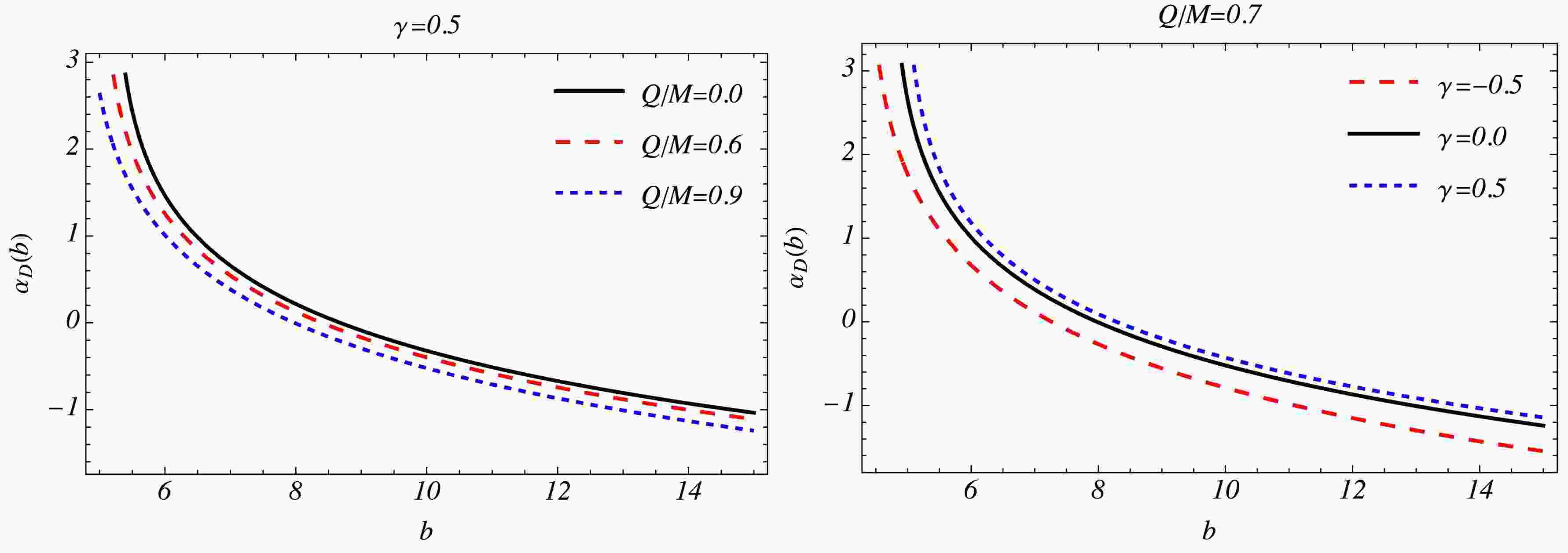 $ r_0\rightarrow r_m $ , Eq. (40) is expressed as$ \begin{aligned}[b] I_D(b) = \;&-\bar{a}\mathrm{log}\left(\frac{b}{b_c}-1\right)+\bar{a} \mathrm{log}\frac{2(3M r_m-4 Q^2 \mathrm{e}^{-\gamma})}{M r_m-Q^2 \mathrm{e}^{-\gamma}}+\\&O((b-b_c)\mathrm{log}(b-b_c)), \end{aligned} $