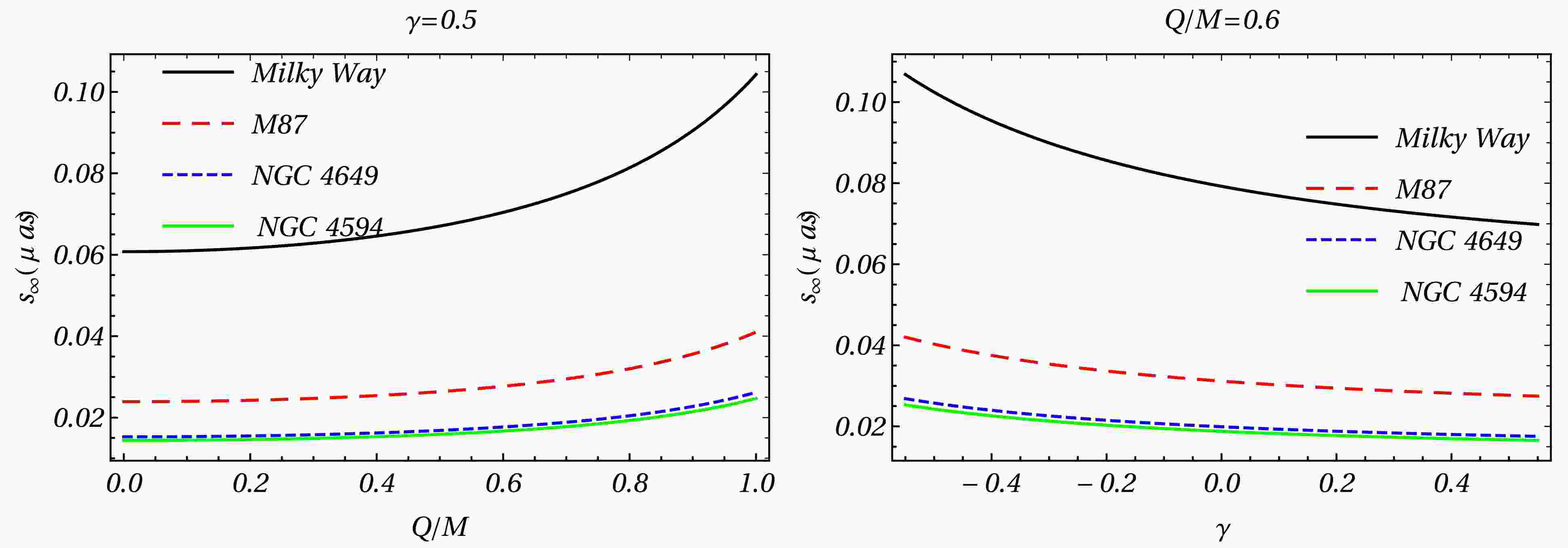 $ \theta_\infty $ ), angular separation between the outermost and asymptotic relativistic images ($ s_\infty $ ), and relative magnification of the outermost relativistic image with respect to other relativistic images ($ r_{\mathrm{mag}} $ ) for Milky Way, NGC4486, and NGC4649 for the case in which the charge of the black hole Q/M and γ parameters are fixed.The strong deflection limit coefficients