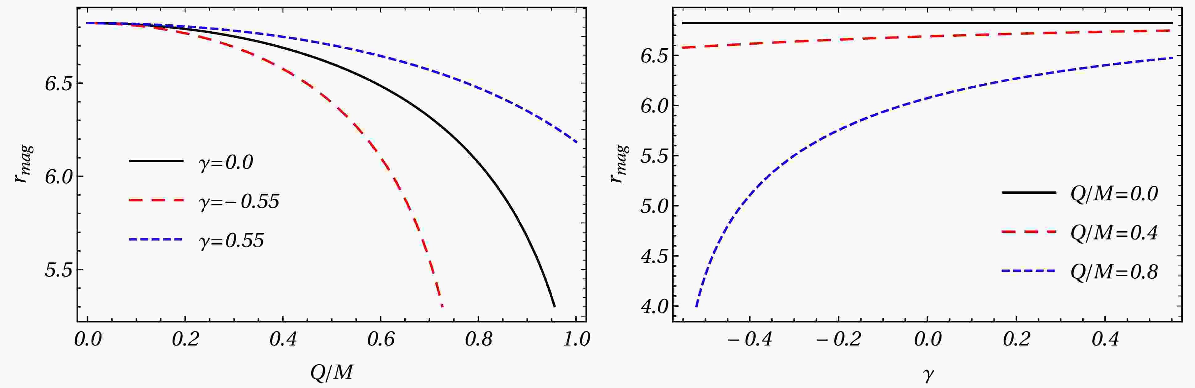 $ Q_\mathrm{e}^2 + Q_m^2 = Q^2 $ . We can obtain the maximum value of black hole charge using Eq. (15) as follows:$ 0 < Q < M\cdot \mathrm{e}^{-\gamma/2}. $