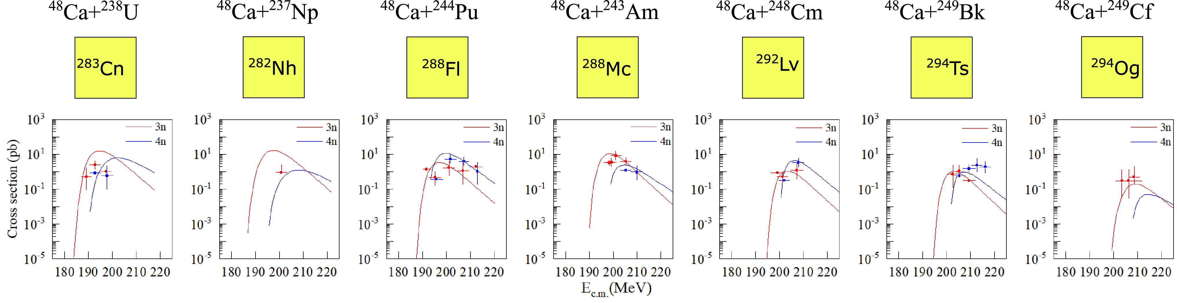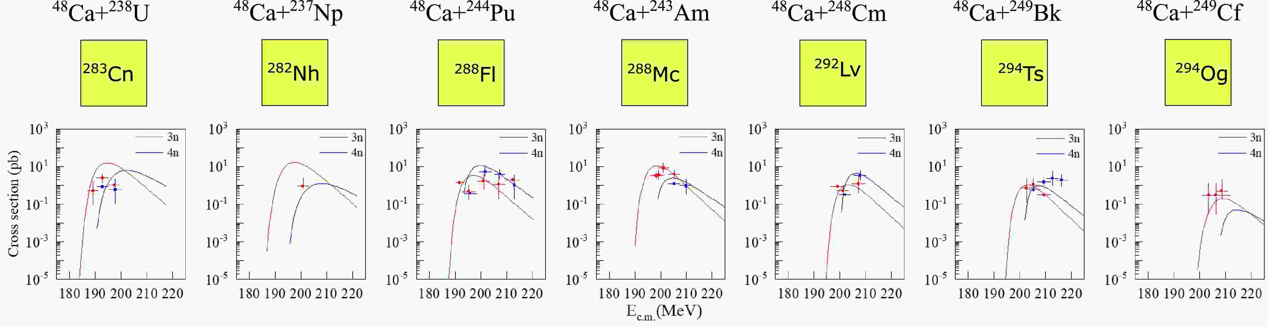 Figure 1. (color online) Excitation function curves for the production of SHE with