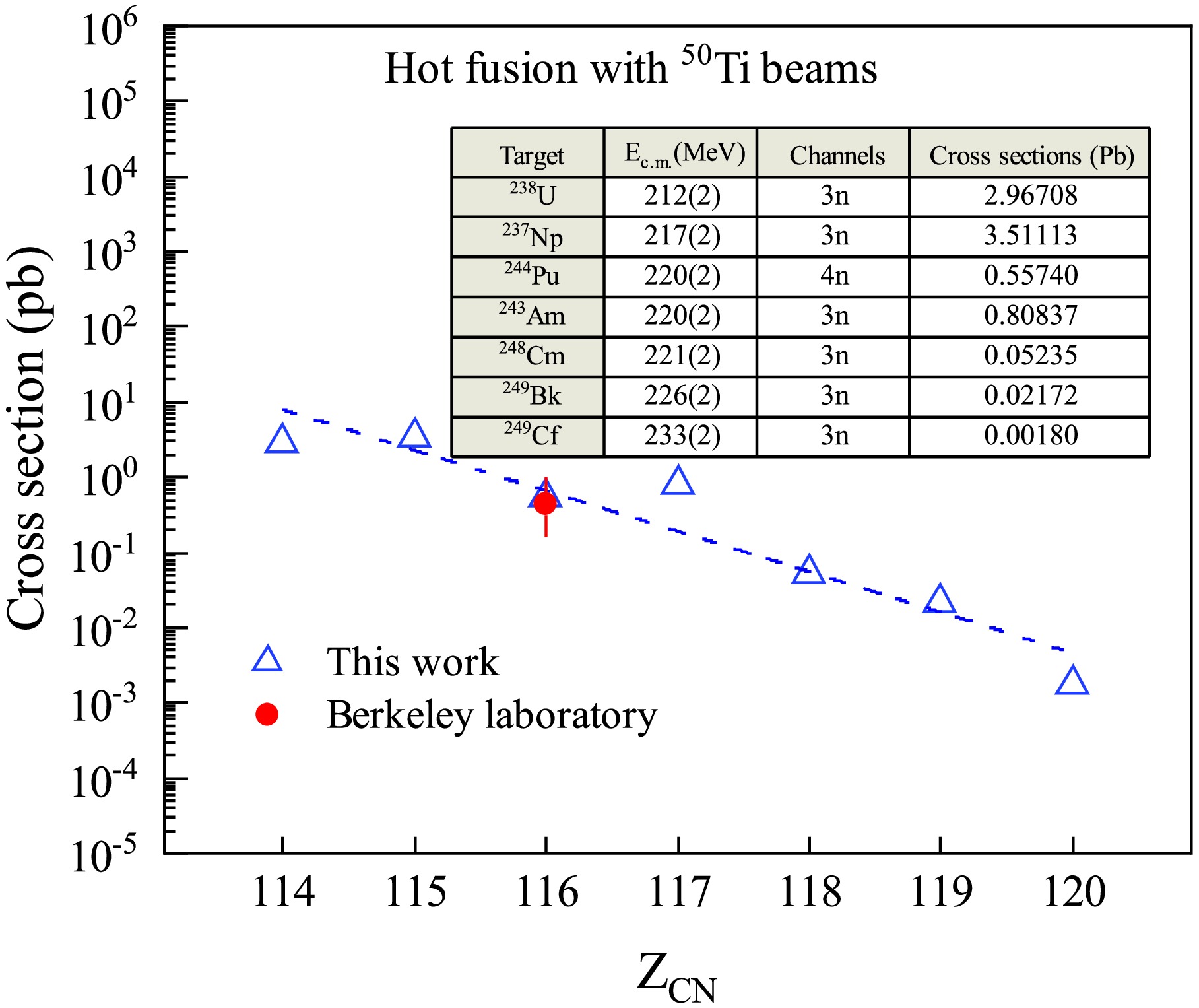 $^{244}\text{Pu}(^{50}\text{Ti}, xn)^{294-x}\text{Lv}$ reaction was studied at Lawrence Berkeley National Laboratory's 88-Inch Cyclotron. The production cross-section was measured to be$\sigma_{\text{prod}} = 0.44^{+0.28}_{-0.58}$ pb, with a center-of-target center-of-mass energy of 220(3) MeV. Recently, it was reported that a new isotope,$^{288}\text{Lv}$ , was produced in the$^{238}\text{U}(^{54}\text{Cr}, 4n)^{288}\text{Lv}$ reaction using a$^{54}\text{Cr}$ beam [43]. However, there have been no published papers on the measured production cross-section so far. Theoretically, a systematic investigation of the excitation functions for the production of SHE (not limited to$ Z > 118 $ SHE) using$^{54}\text{Cr}$ and$^{50}\text{Ti}$ can provide validation and reference for experimentally testing new reaction mechanisms. -