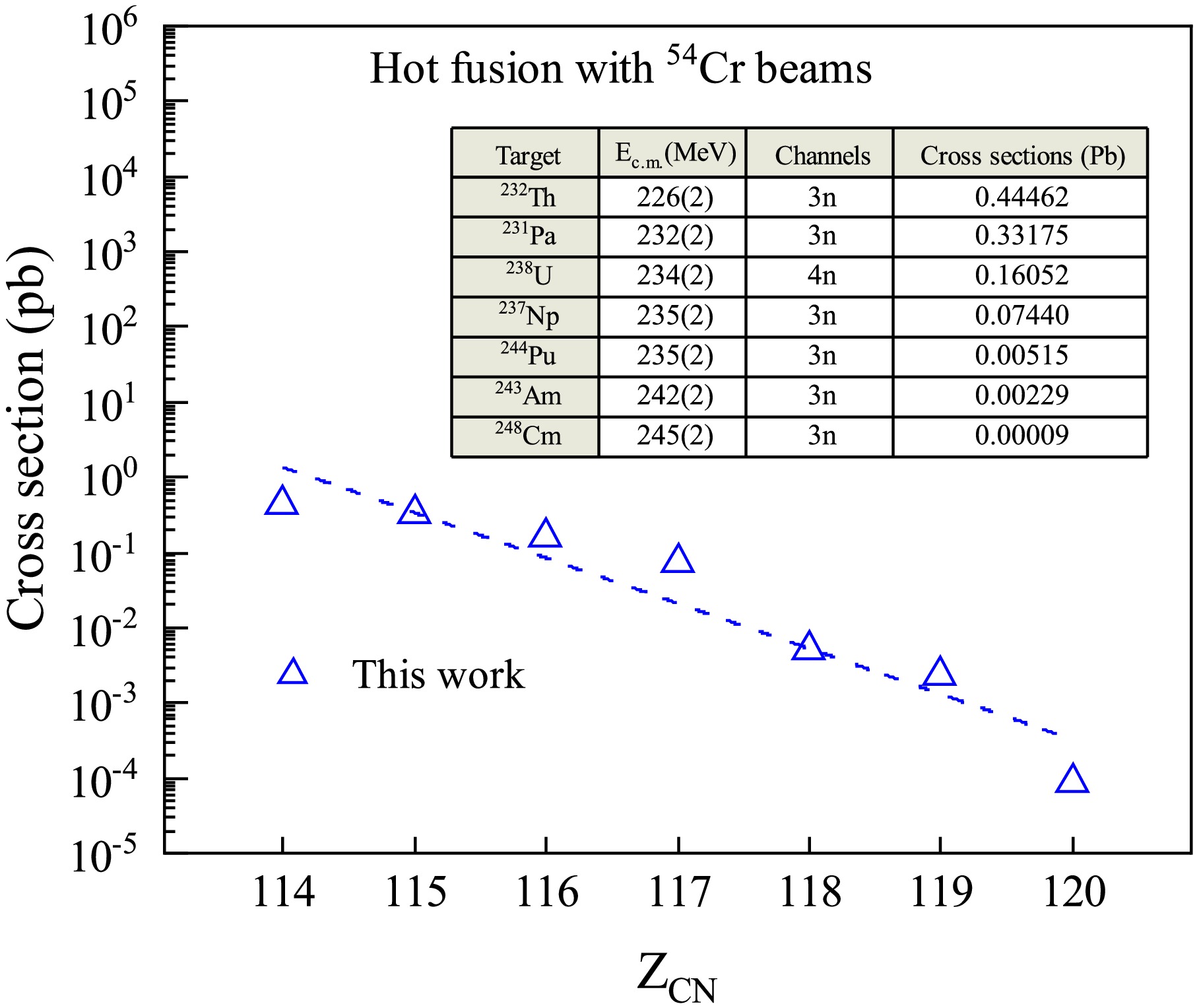$ Z = 114{-}120 $ from the 3n or 4n exit channels with$ ^{54} $ Cr beams.The production of SHE