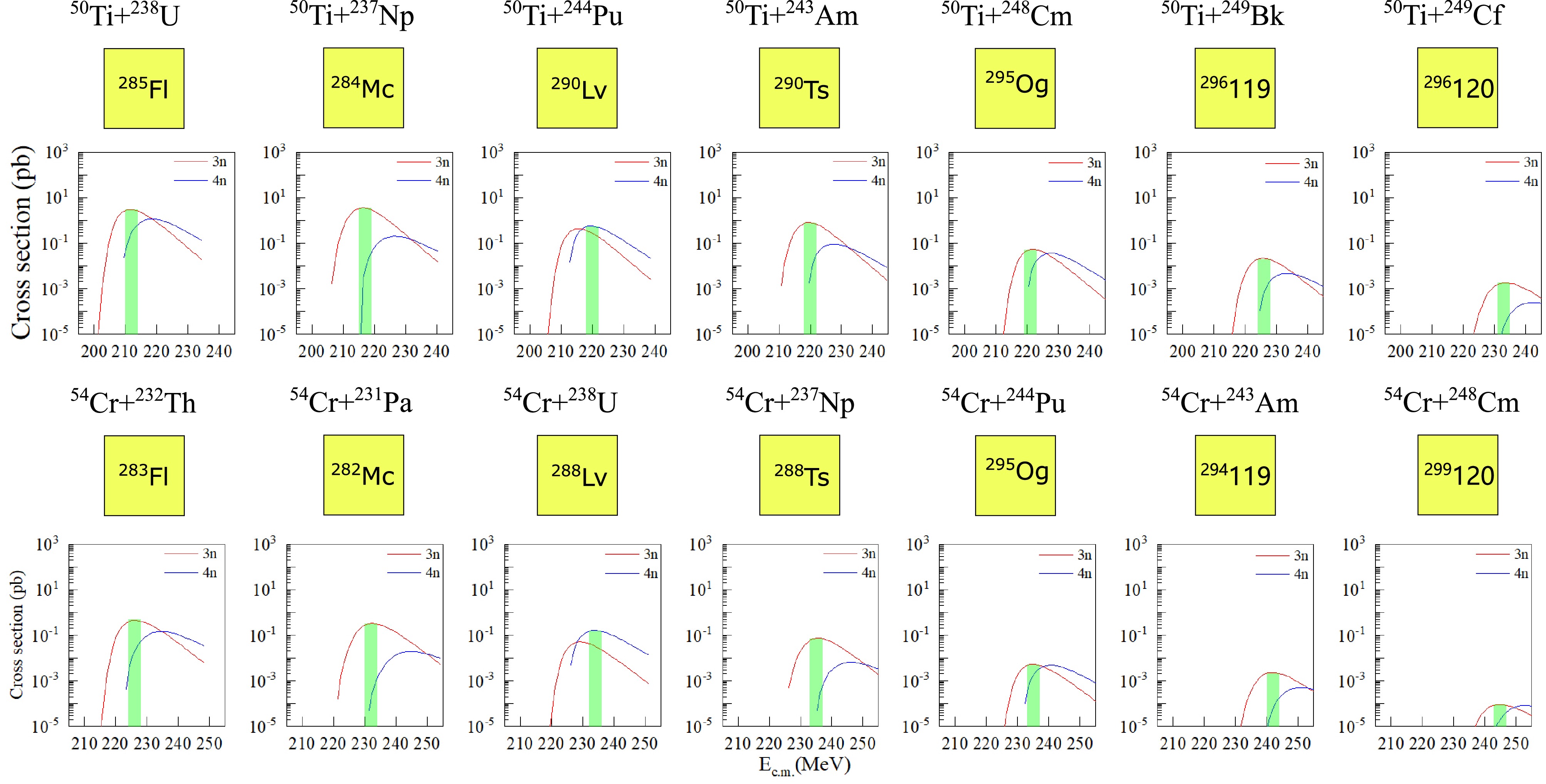 $ Z = 114{-}120 $ using$ ^{50} $ Ti and$ ^{54} $ Cr beams are shown. The red solid line represents the 3n exit channel, and the blue solid line represents the 4n exit channel. The shaded area (green) indicates the distribution of center-of-mass energy corresponding to the maximum production cross-section.According to the current theoretical investigation, the