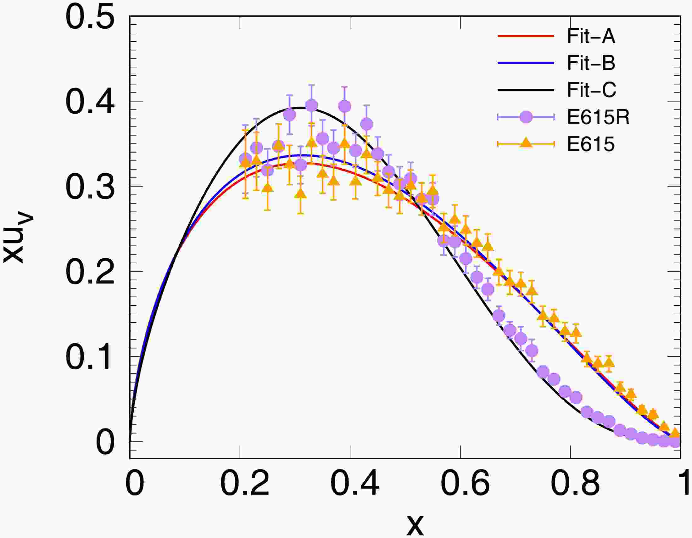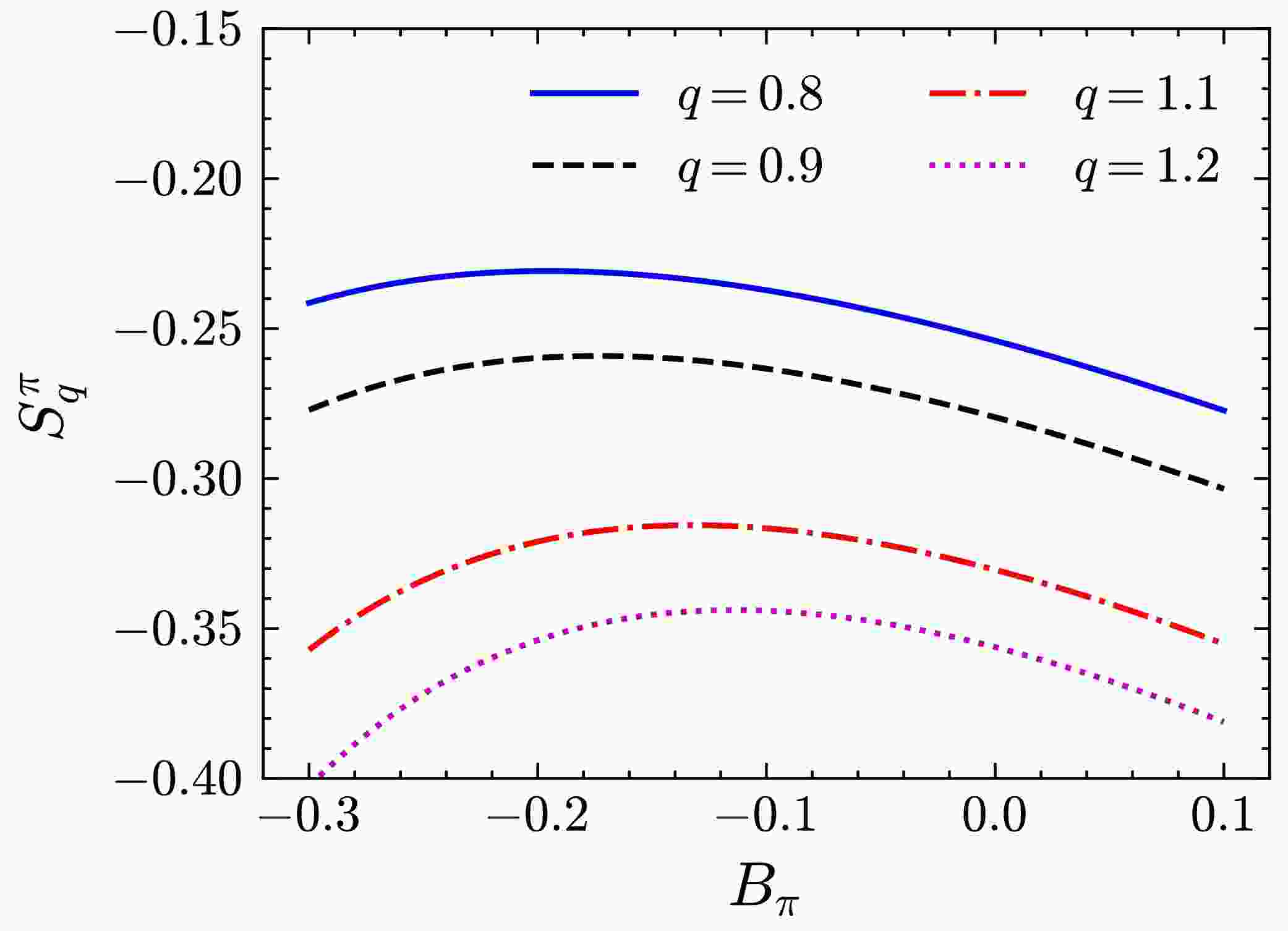 In this section, we describe the use of the MEM with Tsallis entropy to determine the valence quark distributions and the use of modified DGLAP equations with the simplified GLR-MQ-ZRS corrections to perform the $ Q^2 $ evolution for comparisons with the experimental data. As the determination of the initial scale value$ Q^2_0 $ remains a subject of debate, it is treated as a fitting parameter. Simultaneously, parameter g is designated as a free parameter to account for contributions from sea quarks and gluons at the initial scale value$ Q^2_0 $ .The Tsallis entropy for a pion as a function of $ B_\pi $ and q is shown in Fig. 1. As shown in Fig. 1,$ S_q^\pi $ monotonically decreases as q increases, while the maximum entropy is in the$ B_\pi $ direction. Therefore, it is physically realizable to determine the valence quark distributions based on the MEM with Tsallis entropy.  Figure 1. (color online) Tsallis entropy of the valence quark non-perturbative input as a function of $ B_\pi $ and q.To more effectively illustrate the relationship between entropy and the undetermined parameters, a simple approach is tentatively adopted by fixing $ g = 0.295 $ ($ Q^2_0=0.26\,{\rm{GeV}}^2 $ ), which is consistent with the global fit presented in GRS99 [54]. Fig. 2 presents the results for the Tsallis entropy as a function of$ B_\pi $ at various values of q at the initial scale. The undetermined parameters are related to entropy, and these parameters can be determined using maximum entropy principles. However, as q remains unknown, it must be obtained by fitting experimental data. Furthermore, the unfixed initial scale$ Q^2_0 $ exhibits a strong correlation with g; thus, q, g, and$ Q^2_0 $ are treated as fitting parameters from this point.  Figure 2. (color online) Dependence of the Tsallis entropy of valence quarks on $ B_\pi $ at$ q=0.8 $ (blue solid curve),$ q=0.9 $ (black dashed curve),$ q=1.1 $ (red dot-dashed curve), and$ q=1.2 $ (pink dotted curve) at the initial scale.To obtain the optimal value of parameters, the valence quark distribution functions at $ Q^2=20\; {\rm{GeV}}^2 $ are calculated using the modified DGLAP equation. The obtained$ Q^2 $ dependent valence quark distributions are compared with experimental data from E615 [55] (Fit-A). The parameters from Fit-A are listed in the first row of Table 1. As shown in Table 1,$ Q_0^2 = 0.093 $ and$ g = 0 $ yield the minimum value of$ \chi^2 $ . This demonstrates that dressed valence quarks can be regarded as effective degrees of freedom at extremely low-energy scales. The corresponding optimal value of q is 0.915 which deviates from unity, indicating that the correlation between valence quarks plays an important role in the investigation of pion valence quark distributions.$Q^2_0$   g q A B C D $\chi^2$ /d.o.f  Fit-A 0.093 0.0 0.915 1.012 0.006 0.006 − 0.680 Fit-B 0.096 0.0 0.917 1.153 0.072 0.121 0.151 0.638 Fit-C 0.142 0.180 0.928 0.724 −0.132 1.932 24.171 1.445 Fig. 3 shows the up valence quark distribution function at $ Q^2=20\; {\rm{GeV}}^2 $ , obtained by performing the modified DGLAP evolution with the initial distribution in Eq. (5). In Fig. 3, the red line shows that the valence quark distribution function from Fit-A exhibits a good agreement with the E615 data [55]. It should be noted that the E615 data were reanalyzed in Ref. [56], resulting in a significantly softer valence distribution at large-x. Utilizing this modified dataset (E615R), we conducted a fitting using Eq. (5). However, we found that the fitting was inadequate. This may be attributed to the simplicity of the functional form, which requires an additional factor to suppress the valence quark distribution. Consequently, we refitted the experimental data by employing the same valence quark distribution form as that utilized in Ref. [56].$ u_{\nu}(x, Q_{0}^{2})=\bar{d}_{\nu}(x, Q_{0}^{2})=A_{\pi}x^{B_{\pi}}\left(1-x\right)^{C_{\pi}}(1+Dx^2). $  (14) Using Eq. (14), we conducted fittings for the data from E615 (Fit-B) and E615R (Fit-C). As demonstrated by the blue and black lines in Fig. 3, Fit-B and Fit-C effectively characterized the E615 and E615R data, respectively. The last two rows of Table 1 show that, compared with the fit to E615, the fit to E615R yields a higher g value, which yields a softer quark distribution at the initial $ Q^2 $ . It is important to note that when employing various distribution functions from different models to describe the$ J/\psi $ production data, it was observed that the$ J/\psi $ data tend to favor a higher gluon distribution [57]. Table 1 demonstrates an interesting result, that is, in the three sets of fitting results, the q values all deviate significantly from unity, which indicates that the consideration of the correlation between valence quarks is reasonable.To test this outcome, we calculated the moments of the valence quark distributions, which have been well calculated using LQCD and other models [14, 17, 20, 21, 28, 58]. The moments of the momentum fraction of the valence quark distribution are defined as follows: $ \left<x^n \right>=\int\nolimits_{0}^{1}x^nu_{\nu}(x, Q^2){\rm d}x, $  (15) where n is the order of the moment. The lowest three nontrivial moments of the valence quark distribution at $ Q^2=4\; {\rm{GeV}}^2 $ are listed in Table 2, which shows that the predictions are consistent with the results from different models.$\langle x \rangle$   $\langle x^2 \rangle$   $\langle x^3 \rangle$   QCD analyses [58] 0.23 0.099 0.055 DSE [17] 0.24 0.094 0.047 LQCD [20] 0.213 0.101 0.0061 LFHQCD [14] 0.233 0.103 0.056 NJL model [28] 0.236 0.103 0.057 Von Neumann entropy [21] 0.24 0.10 0.057 This work, Fit-A 0.238 0.105 0.058 This work, Fit-B 0.242 0.106 0.059 This work, Fit-C 0.233 0.091 0.044