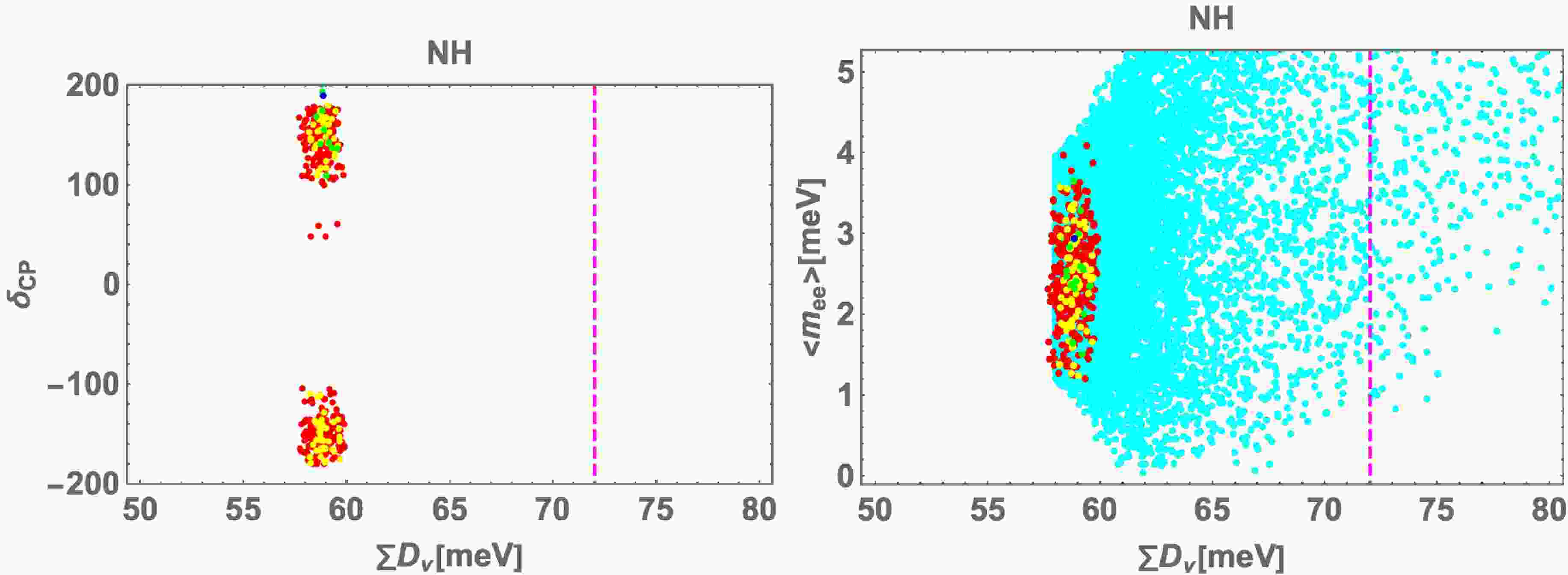 $ \delta_{CP} $ deg (left) and$ \langle m_{ee}\rangle $ meV (right) in terms of$ \sum D_\nu $ meV. We find the most of points are located at$ |\delta_{CP}| = [90-200] $ deg and few points are around$ \delta_{CP} = [40-60] $ deg.$ \langle m_{ee}\rangle \approx [1-4] $ meV. The vertical magenta dotted line is upper bound on results of Planck+DESI [19]$ \sum D_\nu\le $ 72 meV while$ \sum D_\nu $ of our model is$ [58-60] $ meV which is nothing but a trivial consequence of two nonzero mass eigenvalues of active neutrinos.