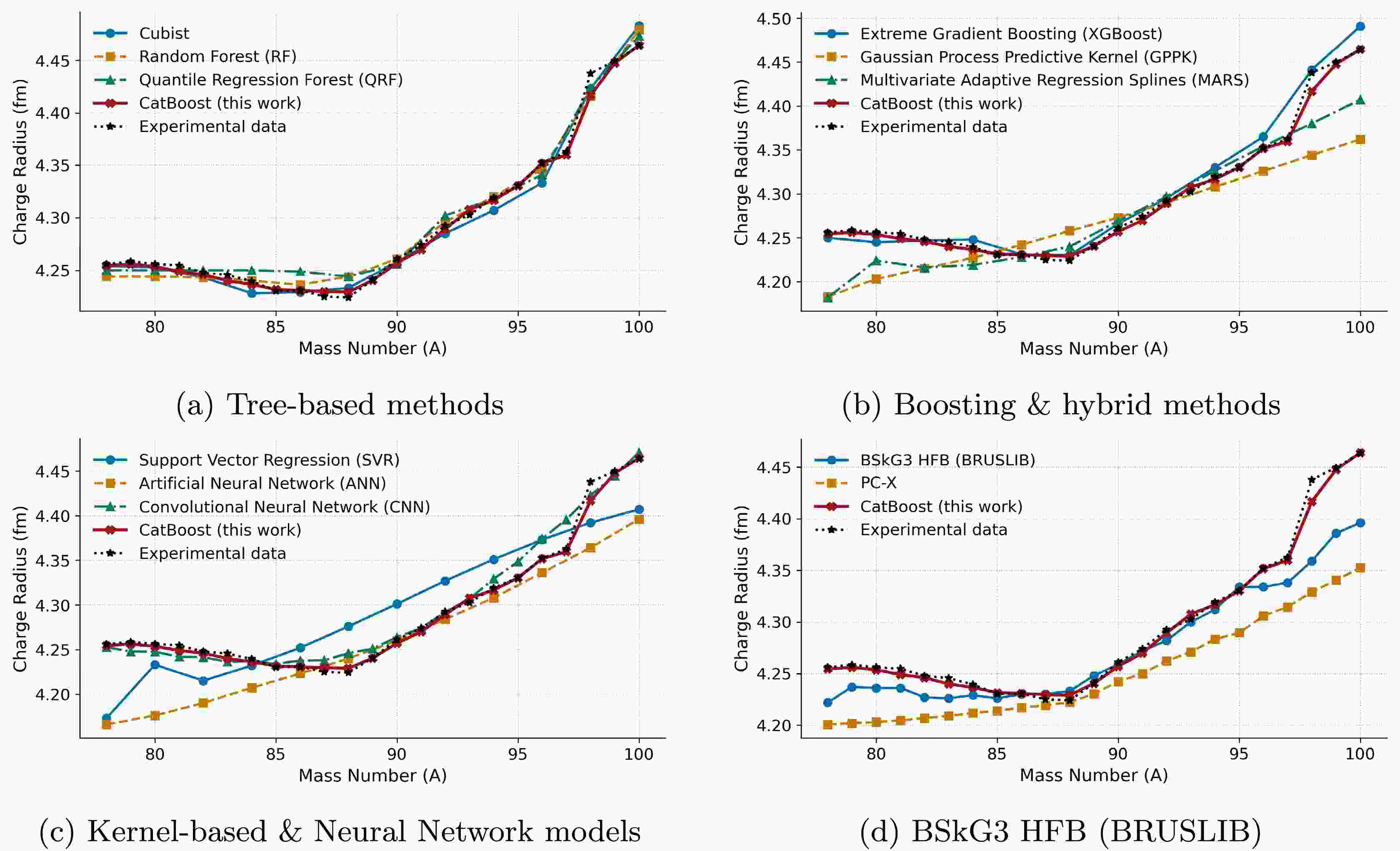 A recent and most comprehensive exploration of modern ML models applied to charge radii predictions, Bayram et al. [31], showed high potential of both modern tree-based algorithms (XgBoost, Cubist) along with conventional ML. These models have a relatively low RMSE (0.03992-0.0119) fm. Jalili et al. [32] have extensively explored Support Vector Regression (SVR) over a diverse range of Z. They pointed out the impact of including A as a feature on the model performance. Their most prominent contribution includes the novel application of RBF (Radial Basis Function) with SVR, a decrease in RMSE from 0.045 fm to 0.016 fm for over 1000 isotopes, as well as improved extrapolation ability of the model. Wu et al. [33] applied feed-forward networks with Z, N, and $ B(E2) $ inputs to capture magic-number kinks and study symmetry-energy links. Utama et al. [34] bridged BNNs with density functional theory to substantially reduce prediction errors by a factor of three. Ma et al. [35] used naive Bayes classifiers to refine HFB and semi-empirical radii, with notable gains in terms of accuracy. Dong et al. [36] reduced errors significantly by combining Bayesian networks with the NP formula, and Dong et al. [37] later included physics-driven features to overcome overfitting. Recently, Jian et al. [38] implemented a continuous Bayesian probability (CBP) estimator and Bayesian model averaging (BMA) to enhance the predictions of charge radii from sophisticated theoretical nuclear structure models. They combined the CBP estimator and BMA to refine charge radii predictions from the HFB, RHB, and semi-empirical liquid-drop models. Their method pushed the standard deviation in predictions of $ R_C $ below 0.02 fm, demonstrating a strong potential for CBP and BMA in accurate predictions of nuclear charge radii.
