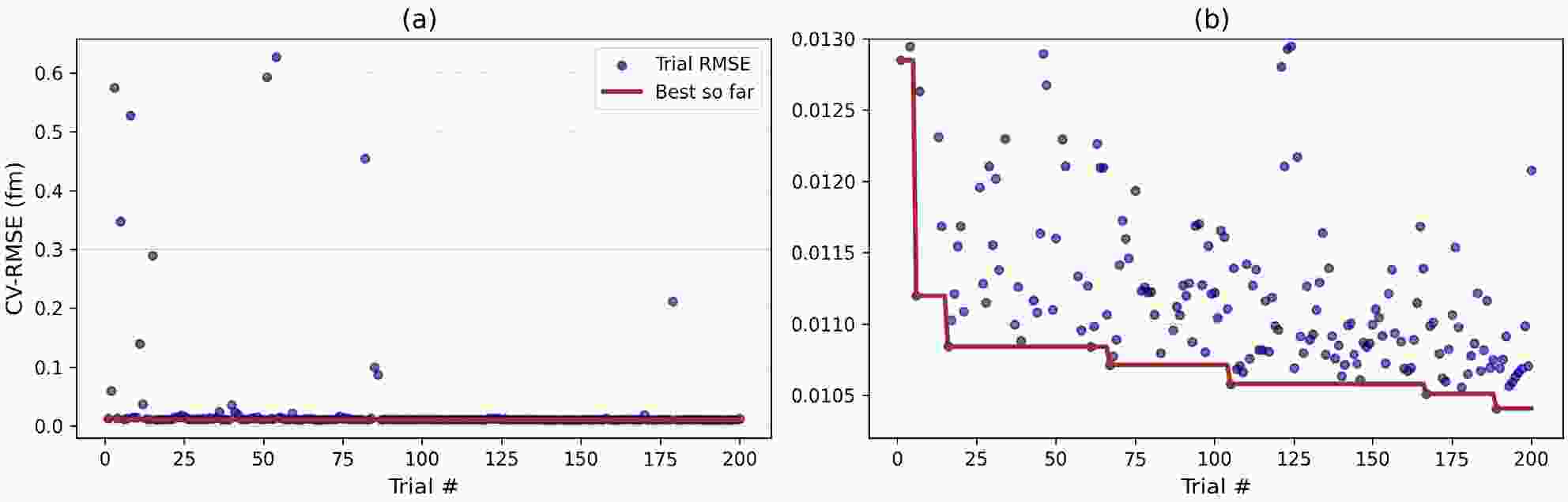 • In Fig. 4, we present a full-scale optimization history (panel a) and a zoomed-in view of the best-so-far trajectory (panel b) of Optuna-driven 10-fold CV hyperparameter search over 200 trials. If we discuss the first 50 trials, in panel (a), trial 0 begins at 0.012849 fm, then for exploration it spikes at trial 1 (0.060102 fm) and trial 2 (0.574825 fm), then settles back to 0.012948 fm at trial 3. We see a prominent improvement at trial 5, where CV-RMSE falls to 0.011198 fm. In subsequent trials (6-49), CV-RMSE oscillates mostly between 0.010880 fm (trial 38) and 0.015588 fm (trial 24), with occasional higher values at trials 10 (0.139897 fm), 14 (0.289320 fm), 35 (0.024157 fm), and 39 (0.035871 fm) as the sampler initially explores various hyperparameter regions.