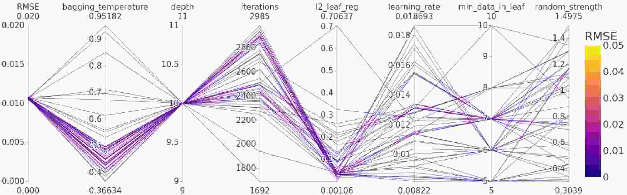 Panel (b), downscaled on the best-so-far CV-RMSE trajectory, which is also present in panel (a), shows extreme outliers clipped off to illustrate the evolution of optimization effectively. The best-so-far curve descends as the trials proceed until trial 188, which achieves a minimum CV-RMSE of approximately 0.0104 fm. This trial remains the best through trial 200. This evolution of rapid early descent followed by continuous fine-tuning confirms that our 200-trial search was both efficient and sufficient to search the optimal CatBoost hyperparameters for the prediction of nuclear charge radii. We observe that additional trials might slightly reduce CV-RMSE, but given that we achieved the desired performance, and it stabilized by trial 200, we limited our search to 200 trials to balance accuracy and computational cost. To study the interactions among the hyperparameters, we filtered out the top 50 trials (with the lowest CV-RMSE) and visualized them using the parallel-coordinates plot among the CV-RMSE and all the hyperparameters. Fig. 4 shows a parallel-coordinates plot of the 50 Optuna trials with the lowest 10-fold CV-RMSE. Each line tracks the hyperparameter settings of one trial, i.e., the number of iterations, learning rate, tree depth, $ l_2 $-leaf regularization, bagging temperature, minimum data in leaf, and random strength; note that it is color-encoded by its corresponding CV-RMSE. Interestingly, all the best configurations use a single depth of 10 and learning rates between 0.008 and 0.018. Moreover, the iteration counts evolve toward the upper end of the search range, and mostly spread between 2300 and 2985. In addition, $ l_2 $- leaf regularization mostly remains below 0.15, the bagging temperature falls in a moderate range, i.e., between 0.4 and 0.55, and the minimum data in leaf is clustered on 5, 6, 7, and 8. The random strength is almost equally spread between 0.8 and 1.4. In Table 6, we report the best hyperparameter values obtained from trial 188 in Optuna. Using these parameters on our processed data, one can reproduce the CatBoost model with exact predictions and evaluation metrics. This highlights the full reproducibility of this study.