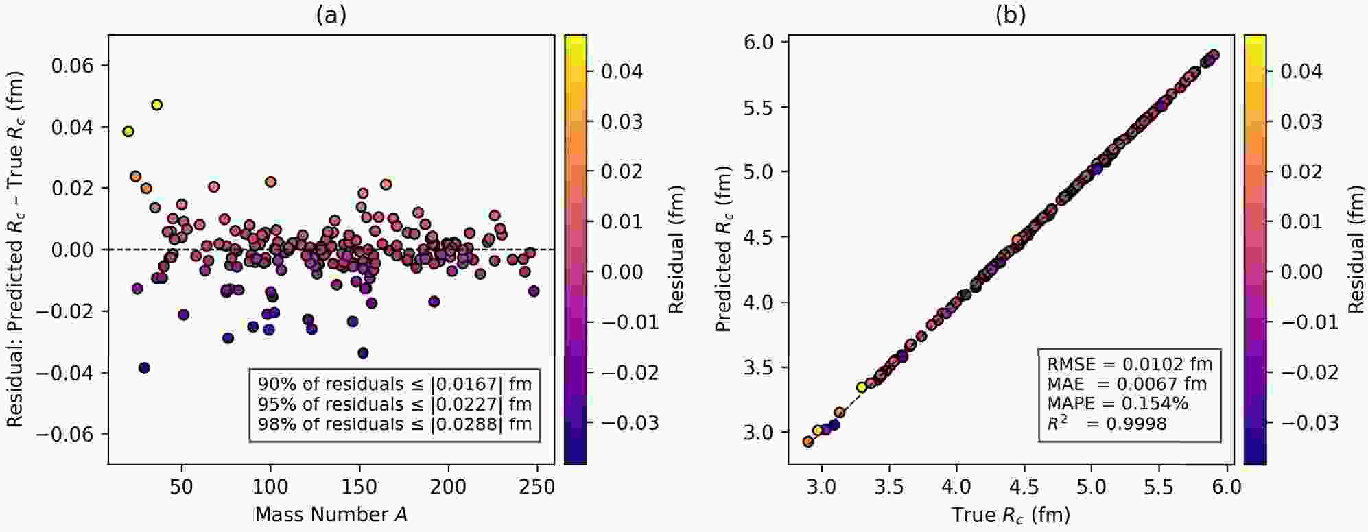 Figure 3.  (color online) (a) Discrepancy Plot of Residuals (Predicted $ R_c $ - True $ R_c $) vs mass number A. (b) Predicted versus true $ R_c $.
