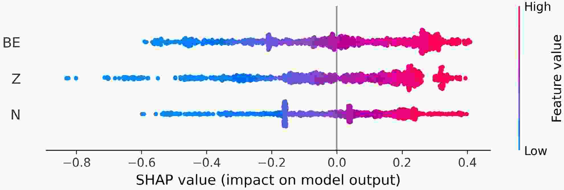 Figure 6.  (color online) Beeswarm plot of SHAP values for the CatBoost charge-radius model.