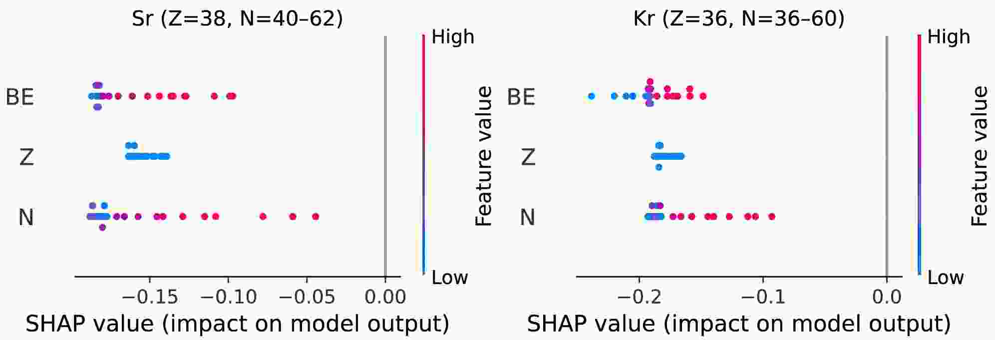 Figure 7.  (color online) Localized SHAP (beeswarm) for Sr (Z=38) and Kr (Z=36) with a single global background. Within each chain, N dominates; Z is near zero (constant locally).