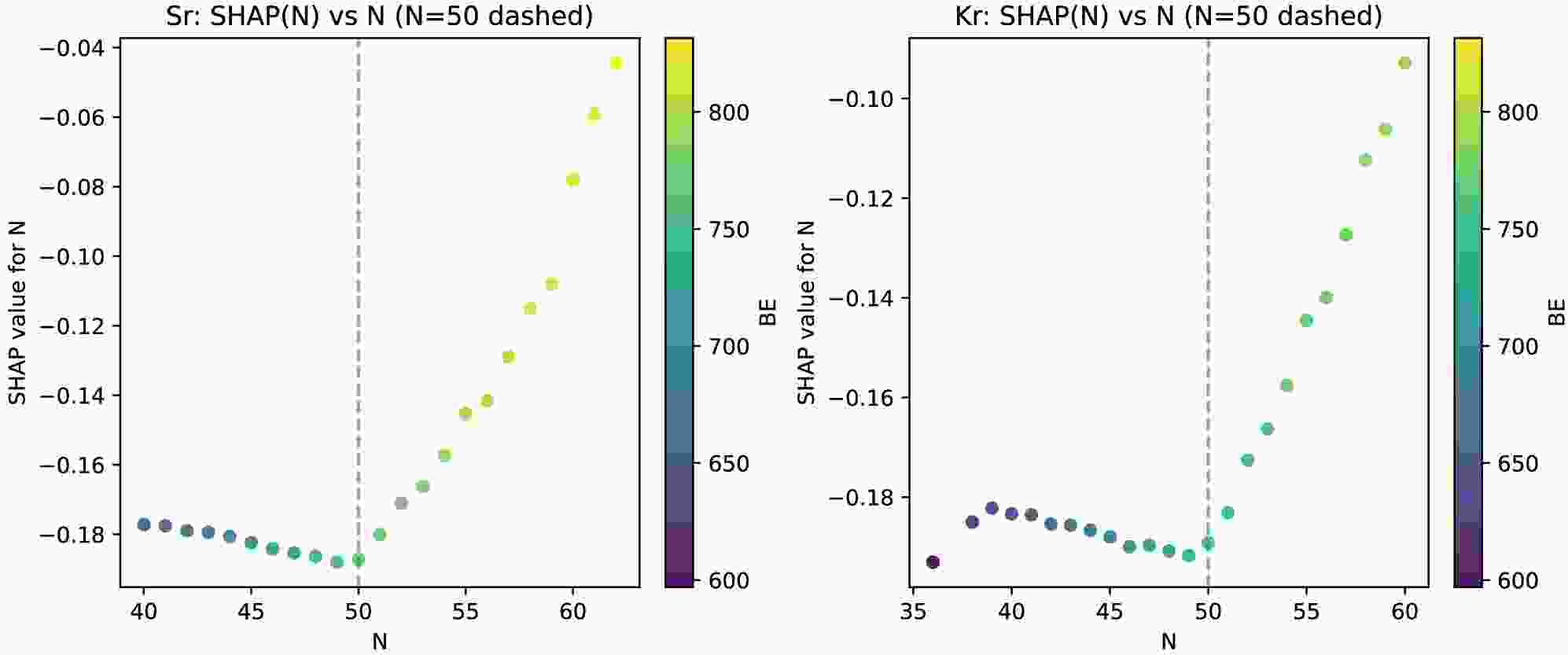 The chain-level beeswarms (Fig. 7) shows that at the chain level neutron number N is the dominant feature (largest horizontal spread), Z is negligible inside each chain (constant value), and BE is a secondary, often negative contributor in this local neutron window. The dependence plot of $ {\rm{SHAP}}(N) $ on N (Fig. 8) shows a sharp minimum at $ N \approx 50 $. For $ N<50 $ adding more neutrons yields negative contributions (model predicts charge radius below the global expectation), whereas for $ N>50 $ the contributions recover toward zero, indicating a trend reversal across the shell closure. When $ BE $ is included as a feature, color-coding shows that although $ BE $ rises with N, the most negative $ {\rm{SHAP}}(N) $ appears near $ N \approx 50 $, demonstrating that at magic number, the local shell effects can override the global trends.