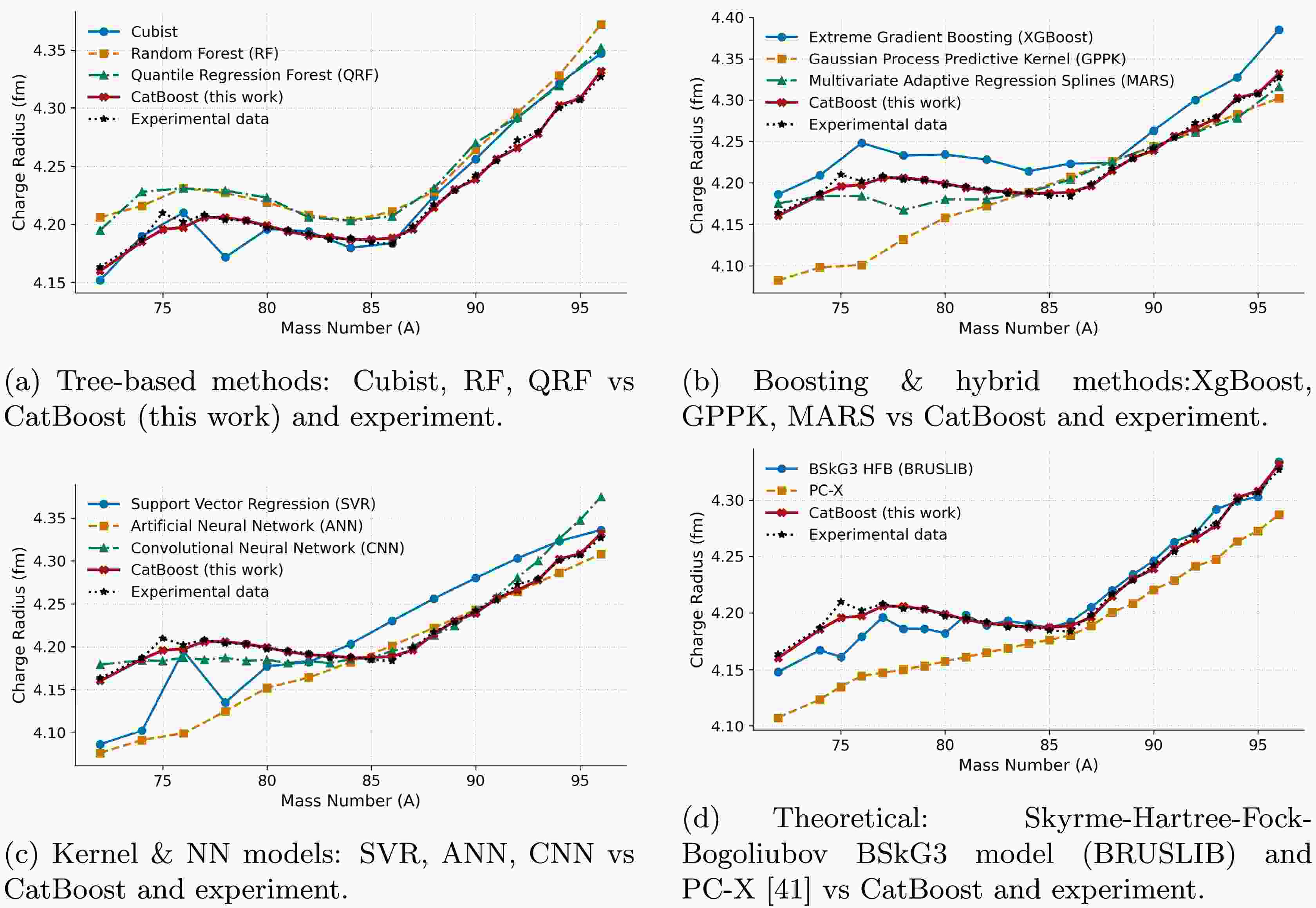 In Fig. 9(b), we compare CatBoost against Extreme Gradient Boosting (XGBoost), the Gaussian Process Predictive Kernel (GPPK), and Multivariate Adaptive Regression Splines (MARS). Similar to RF and QRF, XGBoost also consistently over-predicts the charge radii values and shows a steep slope after A = 50, producing a larger deviation from the experimental values. GPPK under-predicts with quite large errors below A = 80 and then oversmoothes the data points, producing a too flat curve, which shows its inability to reproduce actual chain trends and capture odd-even staggering and kinks at shell closure. MARS, while closer to the experimental slope, underestimates several points between A = 74 to 82. But overall, it follows the trend and captures the kink at shell closure relatively better than tree-based models. But despite this, CatBoost predictions are still superior to those of MARS, as demonstrated by precisely overlapping experimental data points and capturing the chain trend.