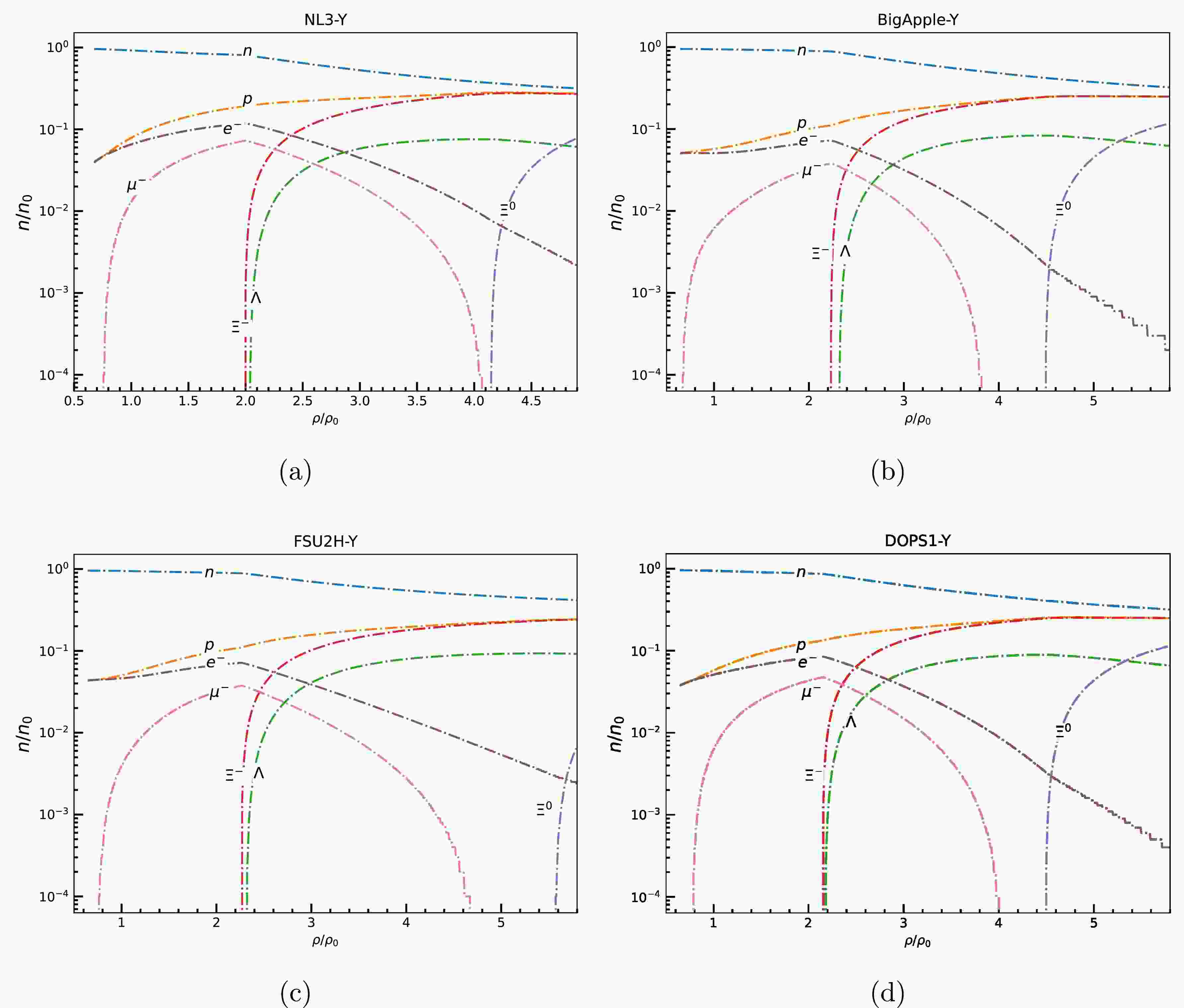 Physically, this behavior can be understood in terms of the neutron chemical potential. Models with a stiffer isovector channel (large L) predict a more rapid rise in the neutron chemical potential with density, which drives the early appearance of hyperons ($ \Lambda, \Xi^{-} $), which can be seen from Fig. 1, 2, 3 and 4. Their onset softens the pressure support in the stellar core, thereby reducing the maximum mass. By contrast, models with a softer symmetry energy slope (low L) delays hyperonization, leading to a more gradual mass reduction. This also explains why extremely stiff EoS models despite reaching high nucleonic maximum masses are disproportionately sensitive to hyperonization effects.