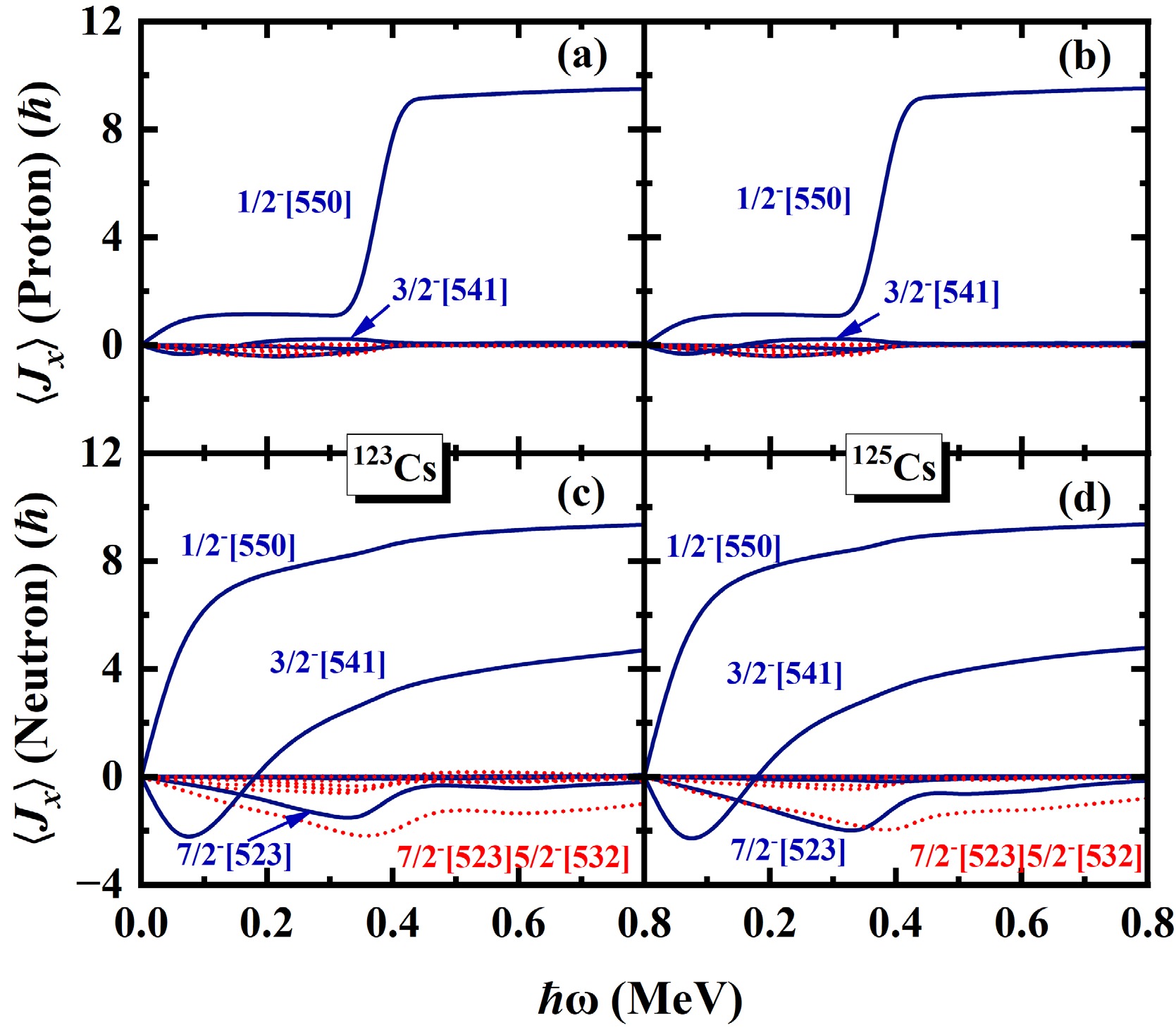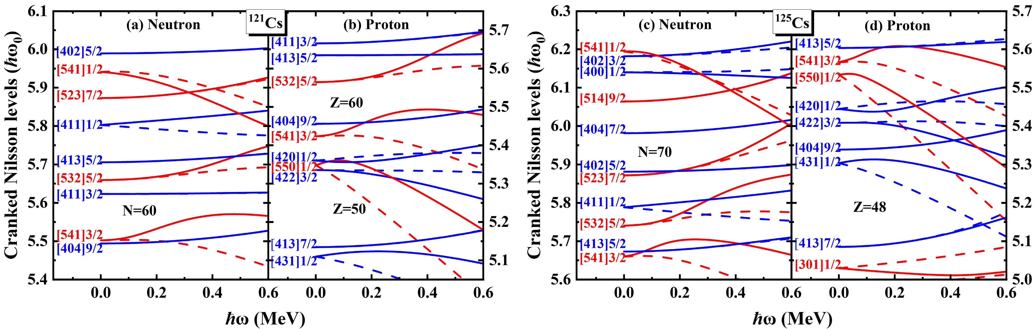 Figure 2 shows the calculated cranked Nilsson levels near the Fermi surface of 121Cs and 125Cs. The positive (negative) parity levels are denoted by blue (red) lines. The signature