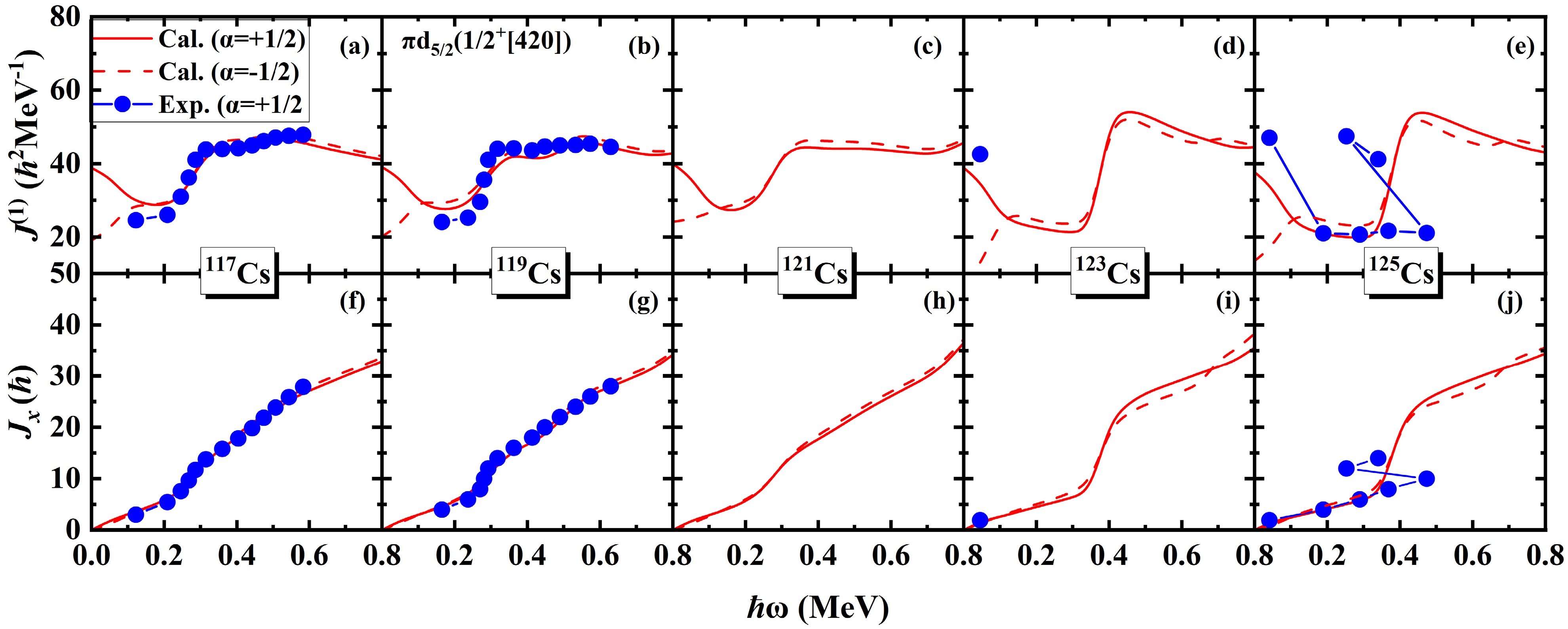 $ \pi h_{11/2} $ and$ \pi d_{5/2} $ bands across this isotopic chain. It is well known that the backbending and upbending phenomena are caused by the alignment of the high-j low-Ω orbitals [27]. Based on present analysis [7, 9, 12, 15, 16, 21, 28], the upbending observed in the$ \pi h_{11/2} $ band at rotational frequencies around$ \hbar\omega\sim0.40 $ MeV and 0.425 MeV has been attributed to the alignment of a pair of [$ \nu h_{11/2} $ ]2. In contrast, the$ \pi d_{5/2} $ band exhibits distinct upbending and backbending at different frequencies, approximately$ \hbar\omega\sim0.20 $ MeV in 117,119,121Cs, and at$ \hbar\omega\sim0.40 $ MeV in 117,119Cs, and$ \hbar\omega\sim0.70 $ MeV in 121Cs, in 123,125Cs the backbending exists at$ \hbar\omega\sim0.30 $ MeV. The variation in the frequency for the$ \pi d_{5/2} $ band across odd-mass 117−125Cs isotopes suggests that the underlying mechanism may involve contributions from different orbitals, which emphasizes the importance of further detailed investigation to elucidate the nature of these alignments.The CSM has been applied to investigate the underlying mechanism of the upbending and backbending behavior with pairing correlations calculated using a particle-number-conserving (PNC) method to study the