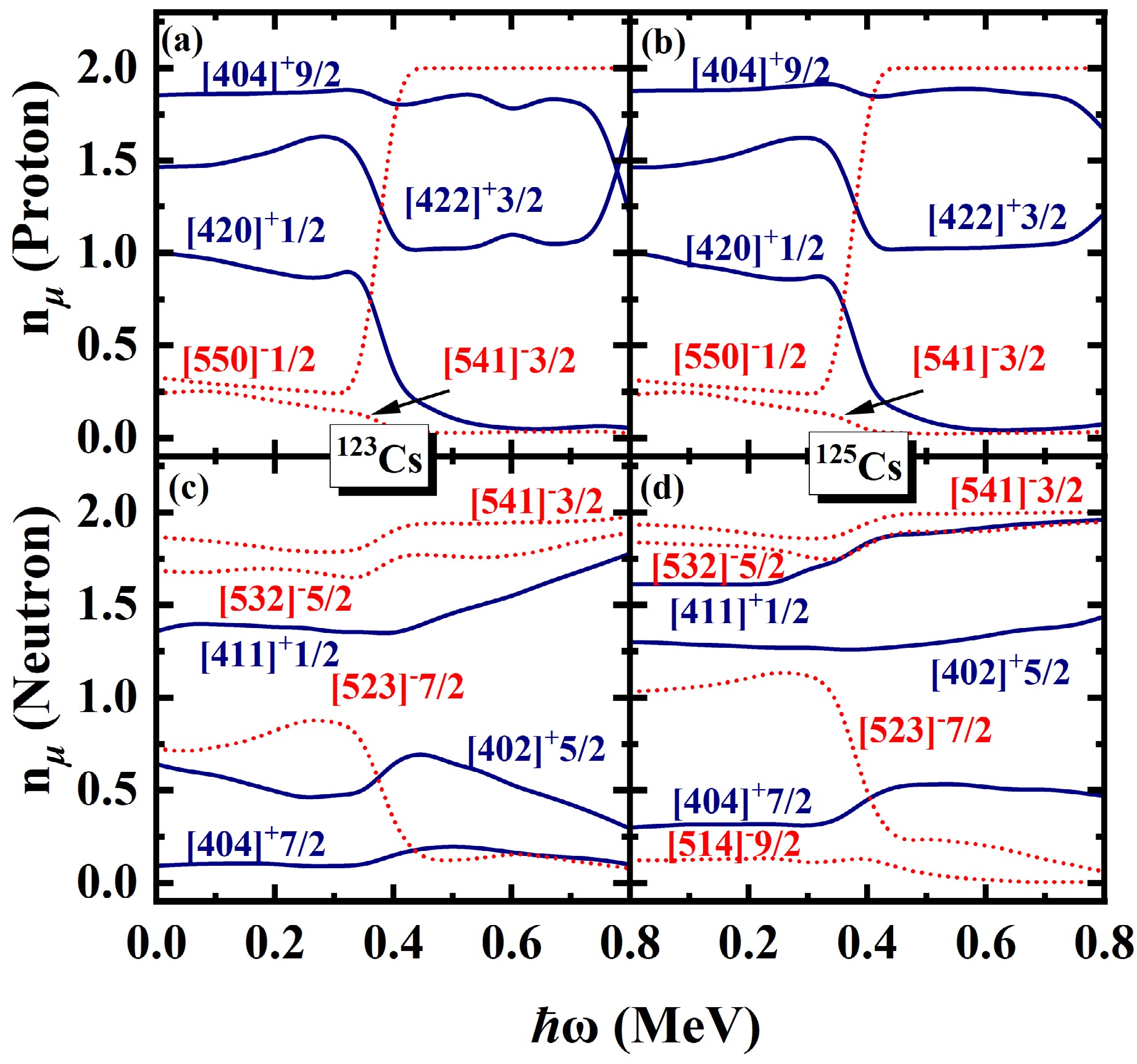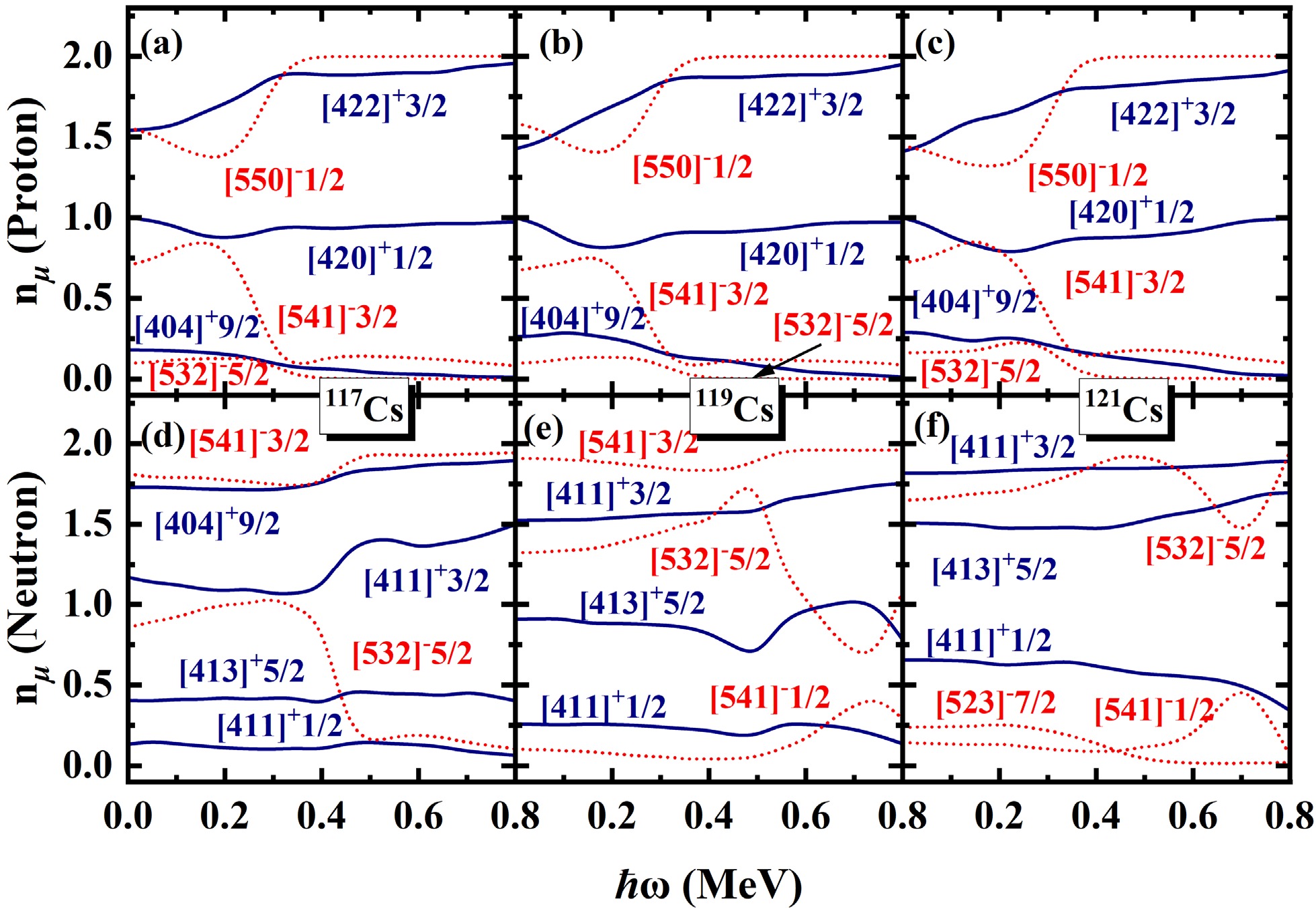 $ N=\sum_{\mu}n_{\mu} $ is exactly conserved, whereas the probability of occupation$ n_{\mu} $ for each orbital varies with rotational frequency$ \hbar \omega $ . This is a key advantage of the PNC approach, as it allows for a more detailed investigation of the evolution of Nilsson levels with rotation. By analyzing the ω dependence of orbitals near to the Fermi surface, valuable insights into the upbending and backbending mechanism can be obtained. The occupation probability$ n_{\mu} $ of each orbital μ near the Fermi surface of the$ \pi d_{5/2} (1/2^+[420]) $ band in 117,119,121Cs are shown in Fig. 4. The top and bottom rows show data for protons and neutrons, respectively. The positive (negative) parity is denoted by blue solid lines (red dotted lines). It is evident from Fig. 4 that, around the rotational frequency$ \hbar \omega\sim0.20 $ MeV for 117,119,121Cs, the occupation probability of π[550]1/2 ($ \pi h_{11/2} $ ) increases sharply from 1.5 to nearly 2.0, whereas the occupation probabilities of π[541]3/2 and π[532]5/2 decrease. This behavior can be understood from Fig. 2. With increasing$\hbar\omega $ , the$ \pi[541]3/2 $ and$ \pi[532]5/2 $ orbitals gradually move away from the Fermi surface, whereas the$ \pi[550]1/2 $ orbital approaches it. As a result, the occupation probabilities of the$ \pi[541]3/2 $ and$ \pi[532]5/2 $ orbitals decrease with increasing cranking frequency, whereas the occupation probability of the$ \pi[550]1/2 $ orbital increases. For the second upbending of 117,119,121Cs, Fig. 4(d) shows the occupation probabilities of$ \nu[541]3/2 $ and$ \nu[411]3/2 $ increase around$ \hbar \omega\sim0.40 $ MeV, while the occupation probability$ \nu[532]5/2 $ sharply decreases. In Fig. 4(e), around the upbending frequency, the occupation probability of$ \nu[541]3/2 $ and$ \nu[532]5/2 $ increase correspondingly while other the occupation probabilities orbitals decrease. For 121Cs, around$ \hbar \omega\sim0.70 $ MeV, the occupation probability$ \nu[532]5/2 $ sharply increases, while the occupation probability$ \nu[541]1/2 $ decreases. Similarly, the occupation probability$ n_{\mu} $ of each orbital μ near the Fermi surface of the$ \pi d_{5/2} (1/2^+[420]) $ band in 123,125Cs are shown in Fig. 5. In Fig. 5, the occupation probability of$ \pi[550]1/2 $ increases gradually from nearly 0 to 2 around$ \hbar \omega\sim0.30 $ MeV, while the occpution of$ \pi[422]3/2 $ ,$ \pi[404]9/2 $ , and$ \pi[420]1/2 $ decrease. For neutrons, the occupation probability of ν[523]7/2 approaches 0 at$ \hbar \omega\sim $ 0.30 MeV, while the occupation probabilities of other orbitals become larger. It may be observed that the first upbending of 117,119,121Cs primarily comes from the contributions of the$ \pi h_{11/2} $ orbitals and the second upbending of 117,119,121Cs mainly comes from the contributions of the$ \nu h_{11/2} $ orbitals. For 123,125Cs, the observed backbending arises predominantly from the combined contributions of both the$ \pi h_{11/2} $ and$ \nu h_{11/2} $ orbitals.