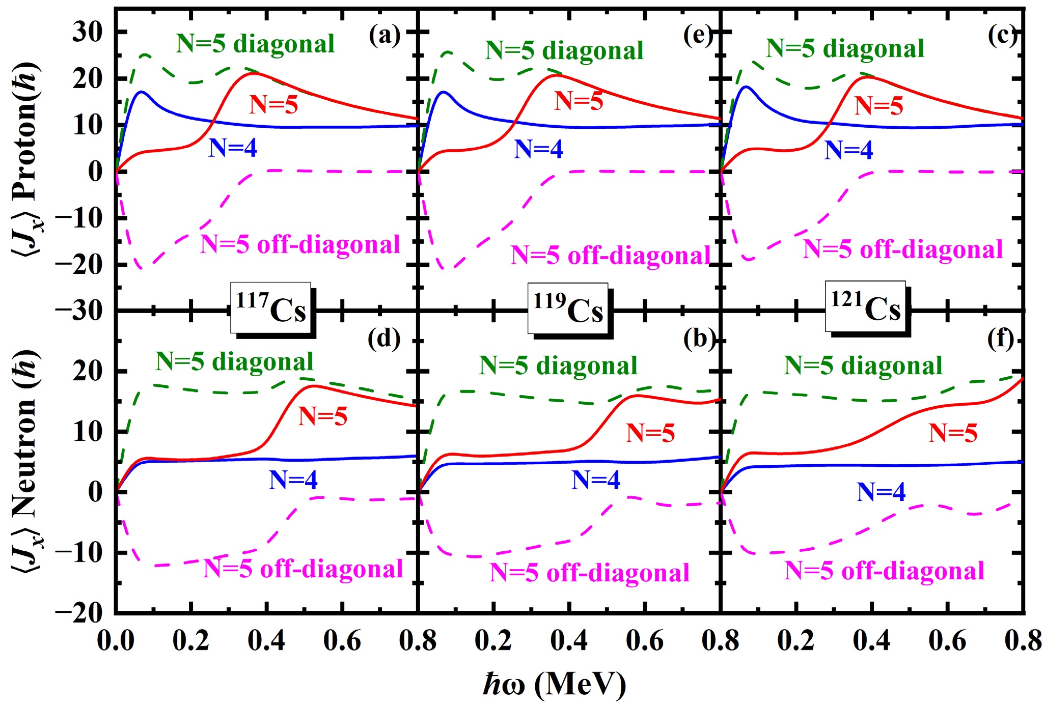 $ \left \langle J_x \right \rangle $ for the$ \pi d_{5/2} (1/2^+[420]) $ band in 117,119,121Cs. The contributions of diagonal$ \sum_{\mu}j_{x}(\mu) $ and off-diagonal$ \sum_{\mu<\nu}j_{x}(\mu\nu) $ from the neutron$ N=5 $ and proton$ N=5 $ major shells ($ \alpha=+1/2 $ ) are shown as dashed lines.