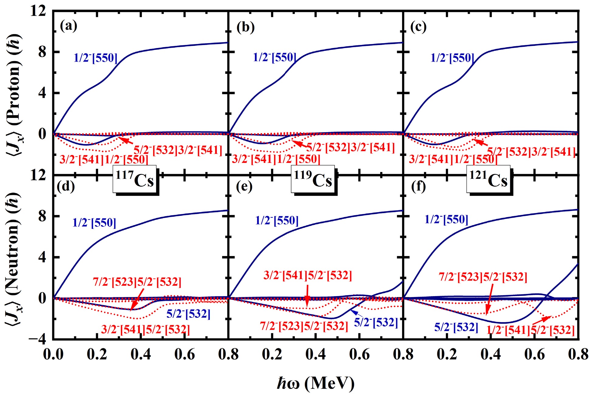 $ \alpha=+1/2 $ (top) and neutron orbital (bottom) in the$ N=5 $ major shell to the angular momentum alignments$ \langle J_x \rangle $ for the$ \pi d_{5/2} (1/2^+[420]) $ band in odd-even 117,119,121Cs. The diagonal (off-diagonal) part$ j_{x}(\mu) [(j_x(\mu\nu)] $ is denoted by blue solid (red dotted) lines.