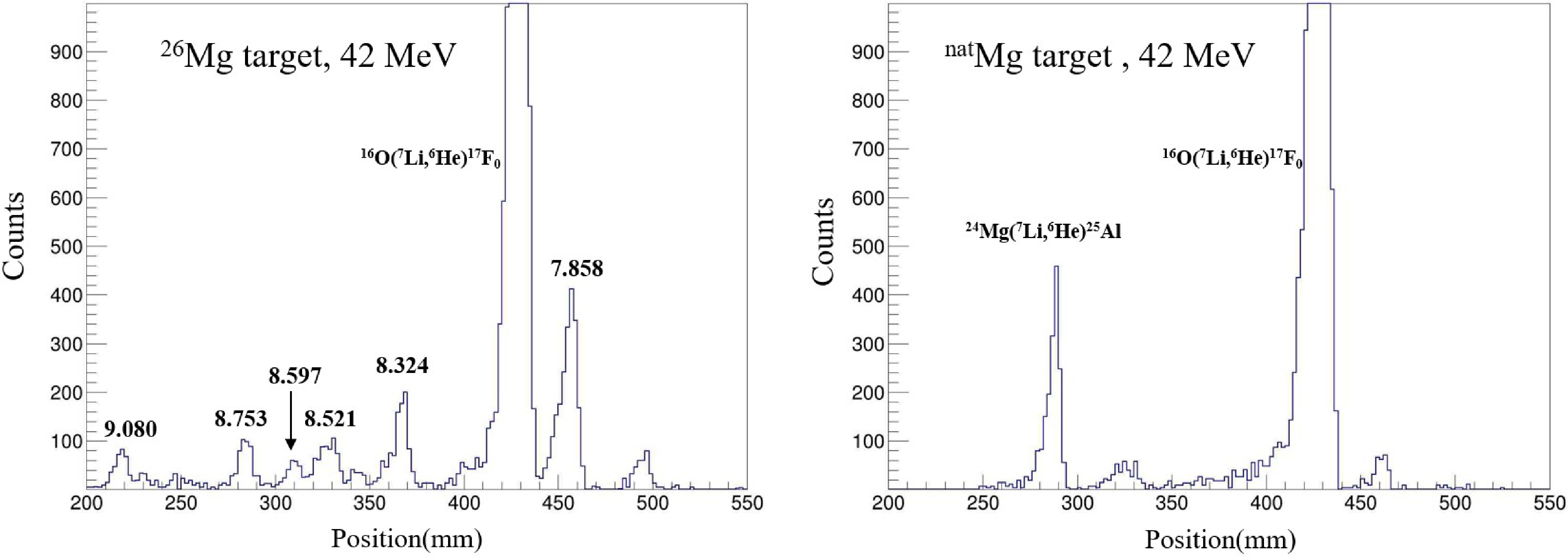 Figure 2. The total spectrum at 7°. The left figure shows the experimental spectrum measured with a 26Mg target, while the right figure shows the background spectrum obtained using a natMg target target for comparison. The six values 7.858 – 9.080 in the figure represent the corresponding excited states.