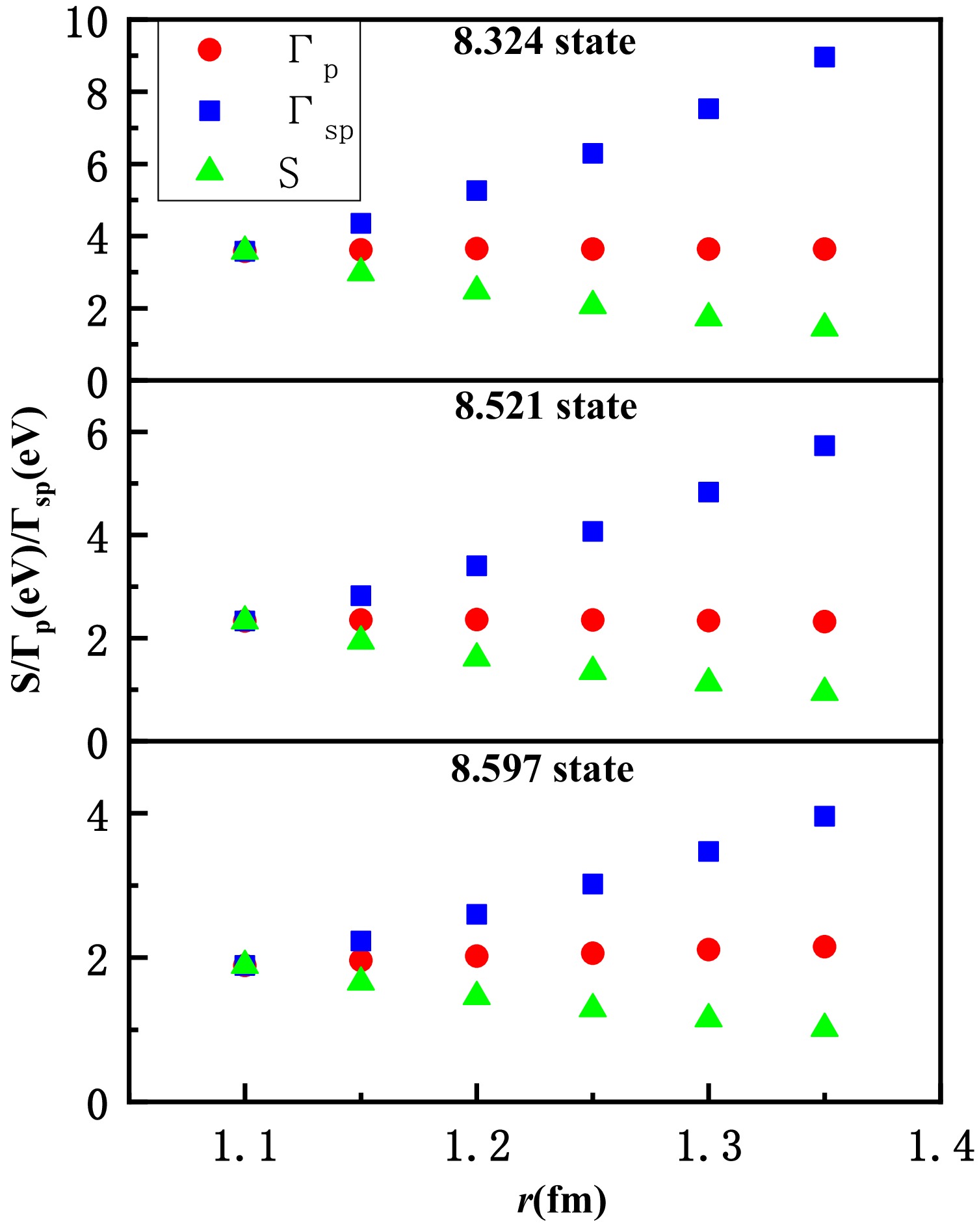 $ \Gamma_p $ , and$ \Gamma_{sp} $ with changes in the radius parameter r. It can be seen that S and$ \Gamma_{sp} $ change significantly with radius, while$ \Gamma_p $ remains almost unchanged (fluctuations are less than 5%), indicating that the proton width for the excited states studied is nearly independent of the model.