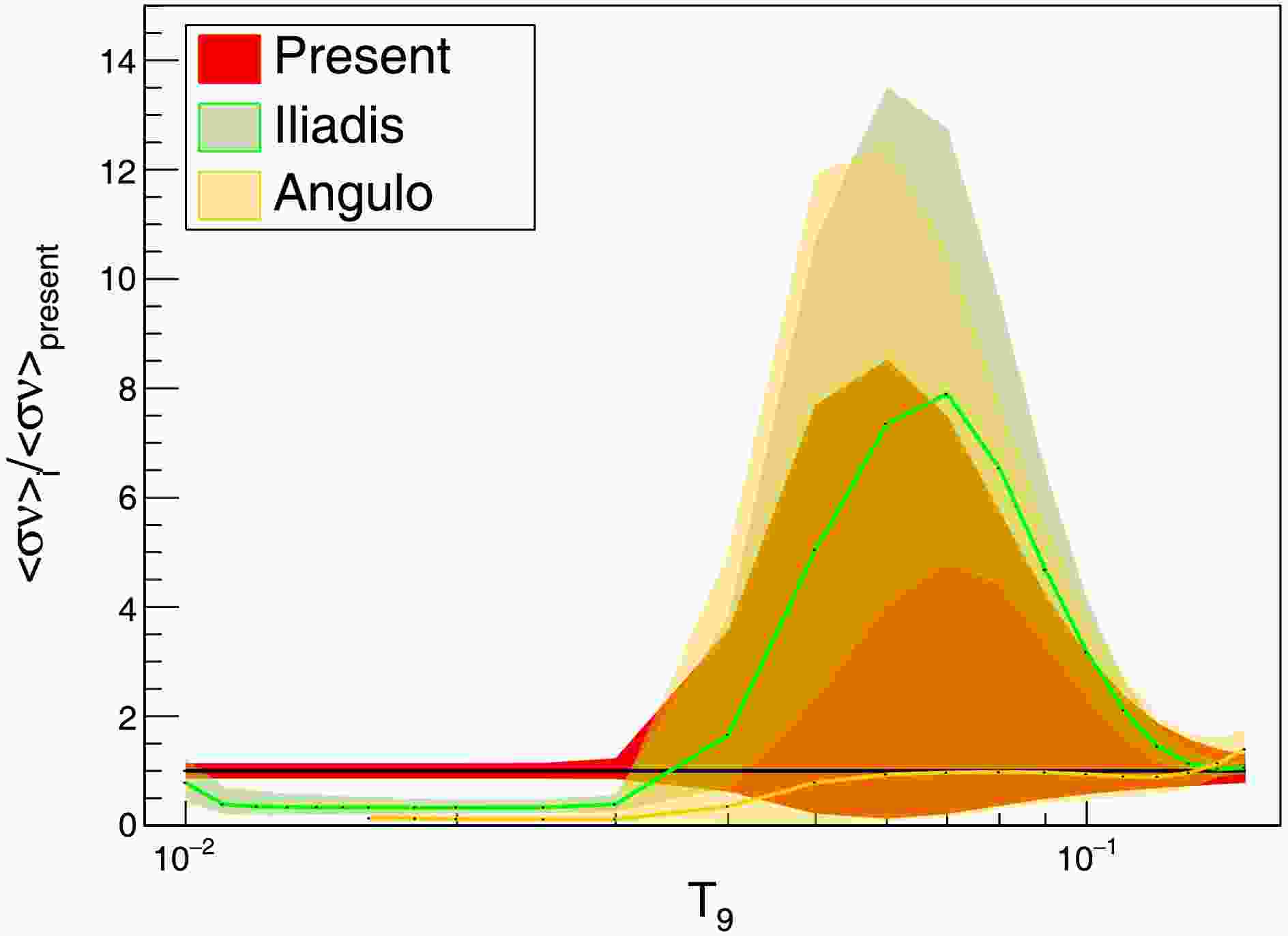 Low Median High 0.010 2.28E-34 2.65E-34 3.02E-34 0.011 5.17E-32 6.02E-32 6.85E-32 0.012 4.70E-30 5.47E-30 6.23E-30 0.013 2.12E-28 2.46E-28 2.80E-28 0.014 5.48E-27 6.37E-27 7.26E-27 0.015 9.13E-26 1.06E-25 1.21E-25 0.016 1.06E-24 1.24E-24 1.41E-24 0.018 6.27E-23 7.30E-23 8.31E-23 0.020 1.61E-21 1.87E-21 2.13E-21 0.025 5.27E-19 6.13E-19 7.02E-19 0.03 2.38E-17 2.79E-17 3.44E-17 0.04 2.56E-15 4.11E-15 1.47E-14 0.05 4.42E-14 2.02E-13 1.56E-12 0.06 5.93E-13 4.56E-12 3.88E-11 0.07 1.16E-11 5.45E-11 4.08E-10 0.08 1.67E-10 4.64E-10 2.67E-09 0.09 1.54E-09 3.14E-09 1.33E-08 0.10 1.03E-08 1.78E-08 5.58E-08 0.11 5.77E-08 9.02E-08 2.14E-07 0.12 2.89E-07 4.21E-07 7.87E-07 0.13 1.31E-06 1.80E-06 2.83E-06 0.14 5.23E-06 6.92E-06 9.68E-06 0.15 1.85E-05 2.36E-05 3.08E-05 Table 4. The present reaction rate for 26Mg(