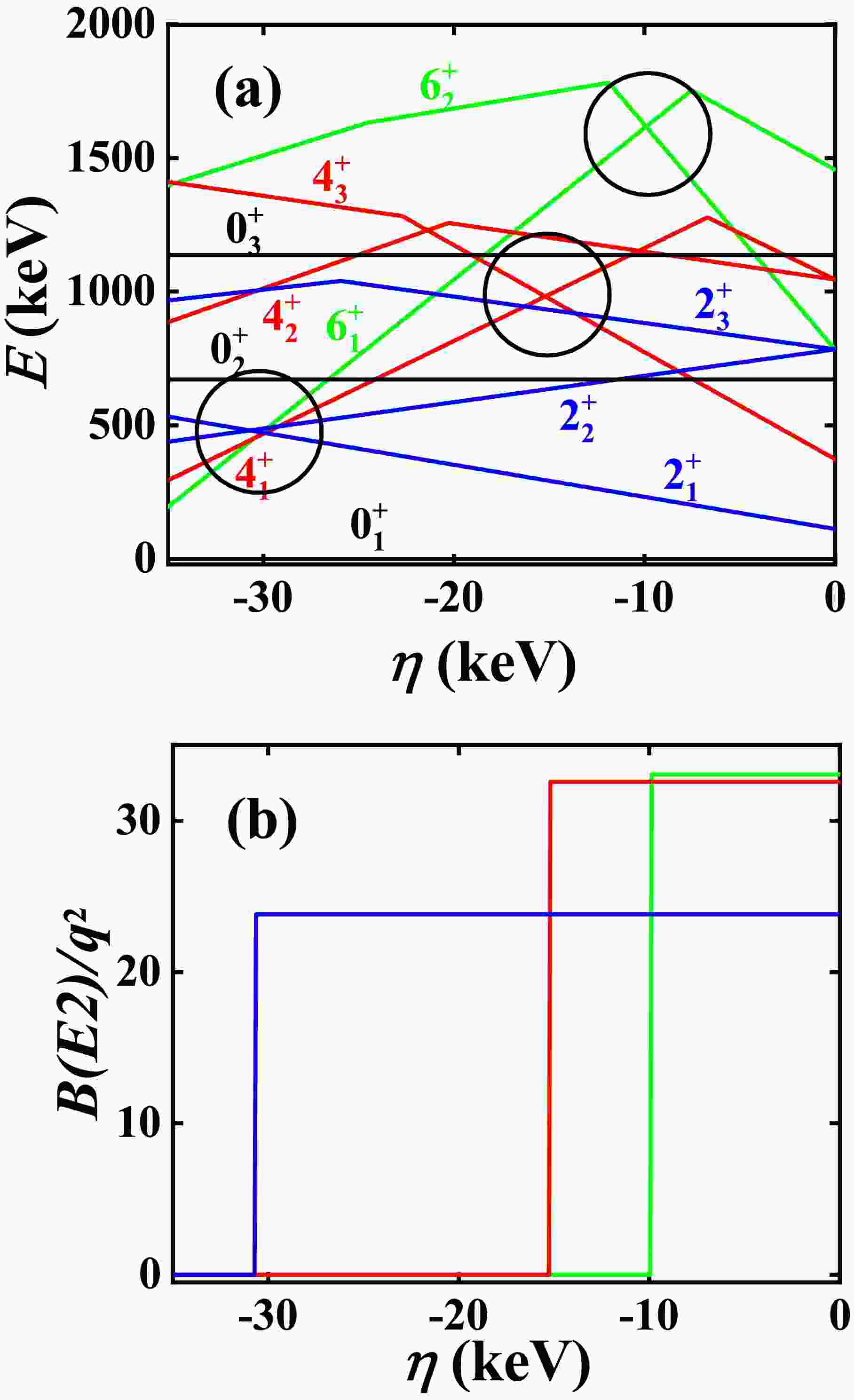 $ 0^{+} $ ,$ 2^{+} $ ,$ 4^{+} $ , and$ 6^{+} $ states when the parameter η decreases from 0. We can observe that the first$ 4^{+} $ state crosses over with another higher$ 4^{+} $ state at$ \eta=-15.20 $ keV (solid red lines and black circle). Before this crossover point, the$ 6_{1}^{+} $ state first intersects with another higher$ 6^{+} $ state at$ \eta=-10.04 $ keV (solid green lines and black circle). When η further decreases, the first$ 2^{+} $ state also crosses over with another higher$ 2^{+} $ state at$ \eta=-30.72 $ keV (solid blue lines and black circle). In the SU(3) symmetry limit, if two levels belong to two different SU(3) irreps$ (\lambda, \mu) $ , the B(E2) transitions between the two levels must be zero. After the crossover point of the two$ 4^{+} $ states and before the crossover point of the two$ 2^{+} $ states (from$ - $ 15.20 keV to$ - $ 30.72 keV), a B(E2) anomaly exists because the$ B_{4/2} $ value is 0.