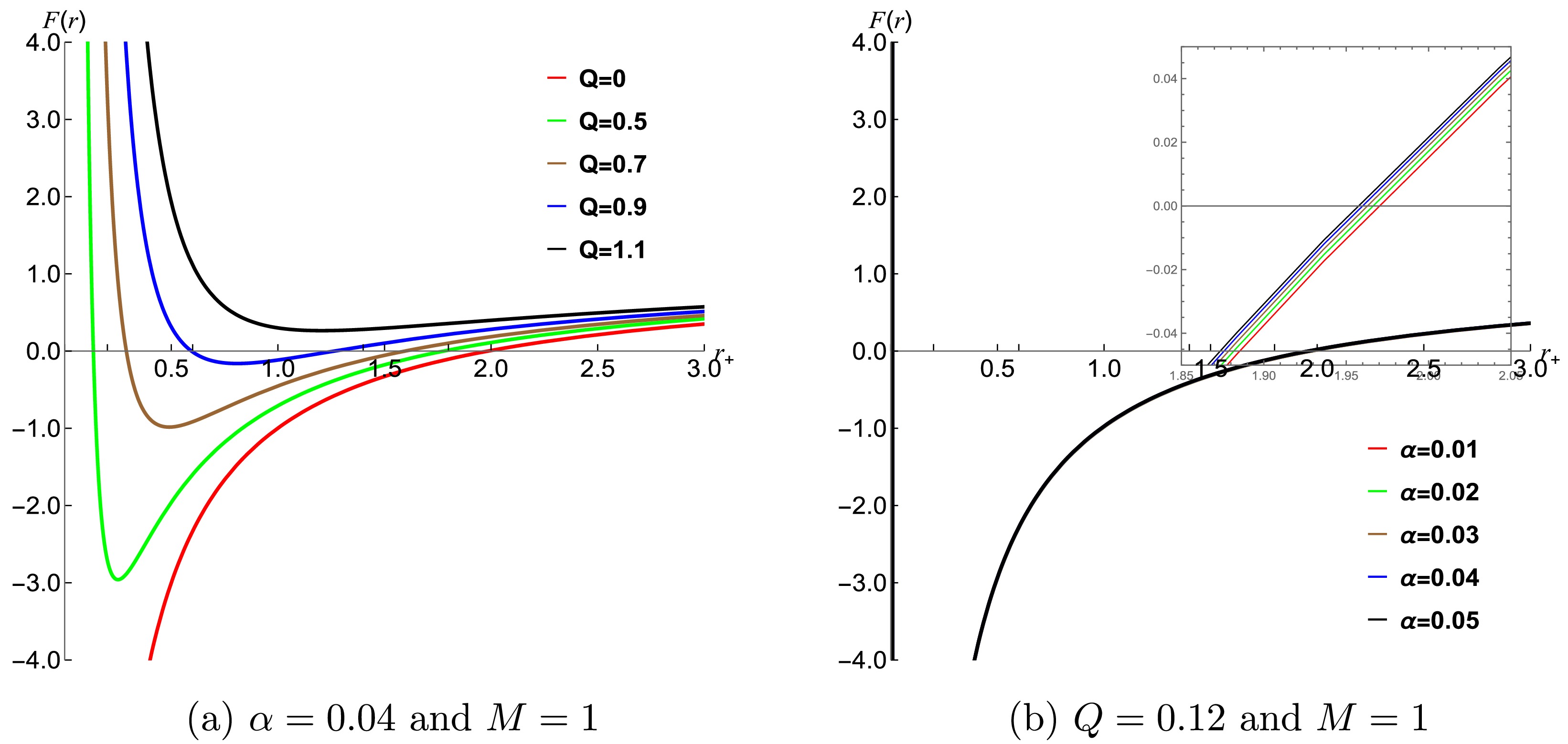 $ r=r_+ $ and determined by$ F(r)=0 $ . M is the mass and can be expressed in terms of the horizon as$ M = \frac{r_+}{2} \left( 1 + \frac{Q^2}{r_+^2} + \frac{r_+^2}{l^2} + 2{\alpha}Q - \frac{{\alpha}^2 r_+^2}{3} \right). $